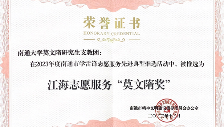 12月20日,2023年度南通市学雷锋志愿服务先进典型颁奖仪式在南通体育会展中心举办。beat365官网莫文隋研究生支教团荣获江海志愿服务“莫文隋奖”,莫文隋青年志愿者协会获评“优秀志愿服务组织”。