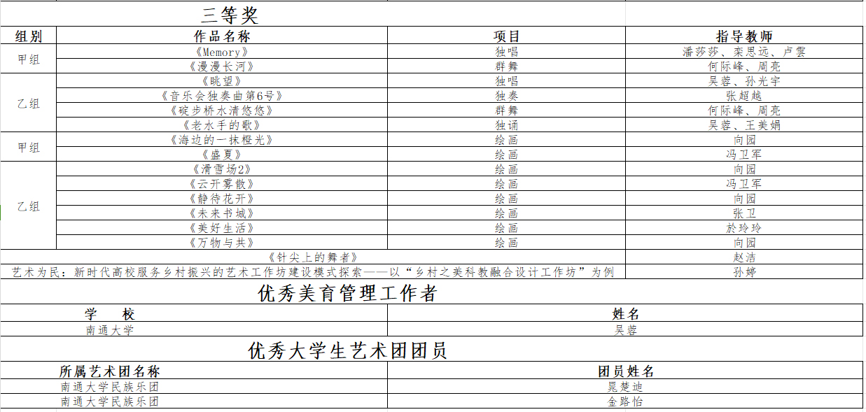 近日,江苏省第七届大学生艺术展演活动评选结果揭晓。beat365官网共有37件参赛作品获奖,其中3件作品获特等奖、10件作品获一等奖、8件作品获二等奖、16件作品获三等奖,获奖数创历史新高。此外,艺术学院吴蓉获评优秀美育管理工作者,beat365唯一官方网站民乐团晁楚迪、金路怡获评优秀艺术团成员。艺术作品《美好生活》、小合奏《Danse Macabre, Op.40 》将代表学校参与国赛角逐。备赛期间,校党委常委、副校长吉明明亲切慰问了参赛师生代表。
