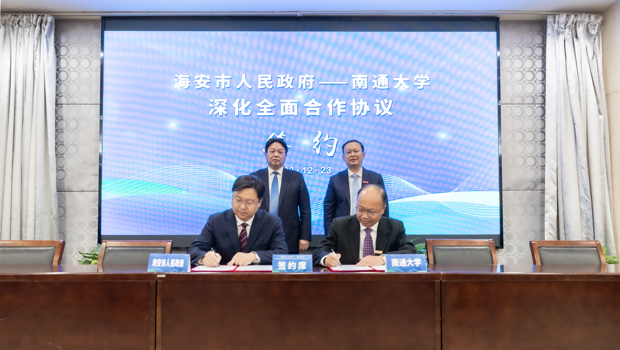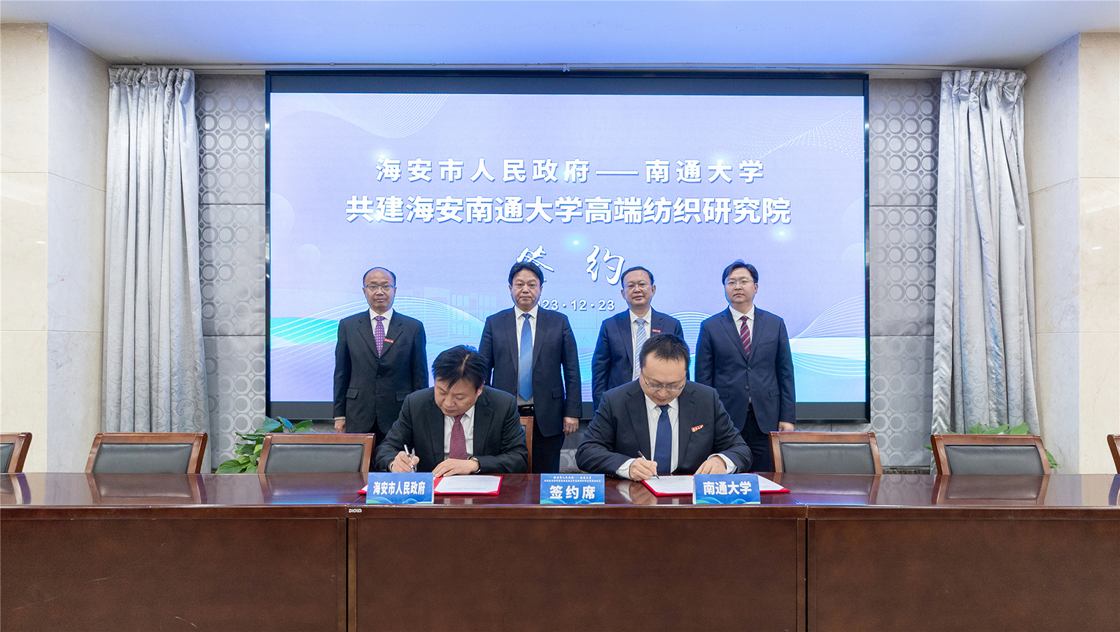 12月23日下午,beat365官网与海安市人民政府举行深化全面合作暨海安beat365唯一官方网站高端纺织研究院签约仪式。校党委书记尚庆飞,校党委副书记、校长杨宇民,校党委常委、副校长吉明明,校党委常委、组织部部长吴如高,南通市副市长、海安市委书记、海安经济技术开发区党工委书记于立忠,海安市委副书记、市长谭真,海安市副市长夏卫军出席活动。签约仪式由校党委常委、副校长华亮主持。