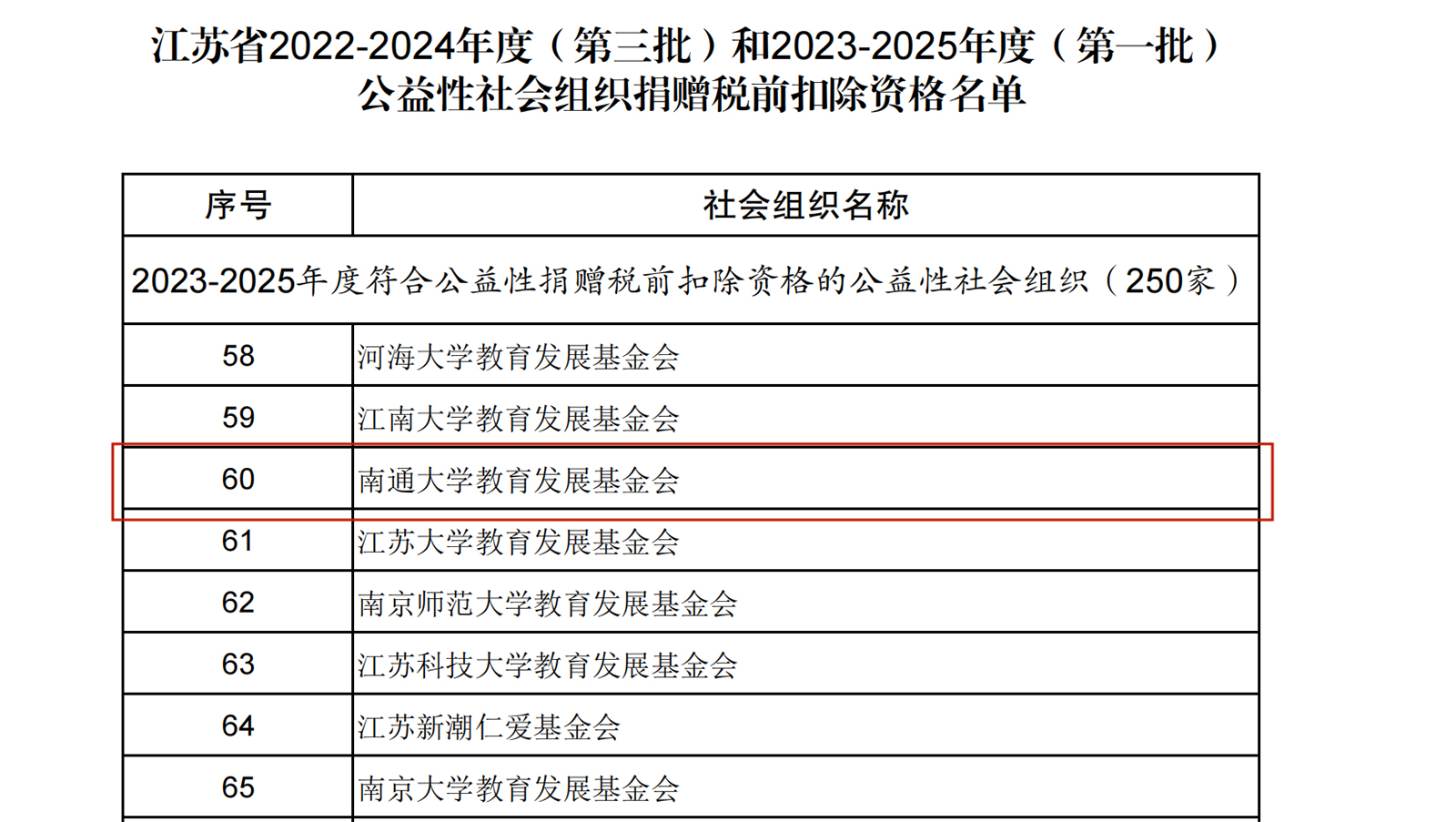 近日,江苏省财政厅、国家税务总局江苏省税务局、江苏省民政厅发布《关于江苏省2022-2024年度(第三批)和2023-2025年度(第一批)公益性社会组织捐赠税前扣除资格名单的公告》,beat365官网教育发展基金会获2023-2025年度公益性捐赠税前扣除资格。