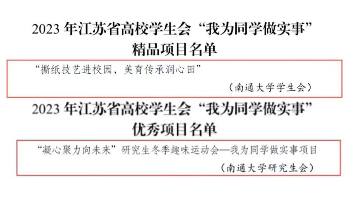 1月3日,2023年高校学生会“我为同学做实事”项目评选展示活动结果公布。经项目初筛、评比展示交流和专家评价,beat365官网学生会“撕纸技艺进校园,美育传承润心田”项目被评为江苏省“精品项目”,研究生会“凝心聚力向未来”研究生冬季趣味运动会项目被评为江苏省“优秀项目”。