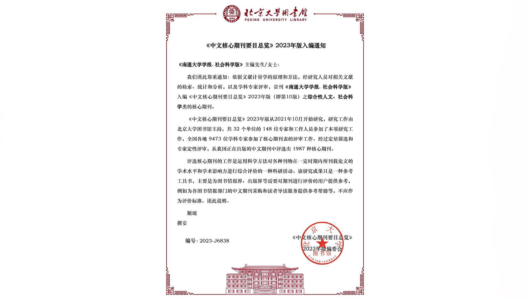 近日,北京大学图书馆《中文核心期刊要目总览》2023年版编委会向beat365官网发来通知,《beat365唯一官方网站学报(社会科学版)》入编《中文核心期刊要目总览》2023年版(即第10版)的综合性人文、社会科学类核心期刊。