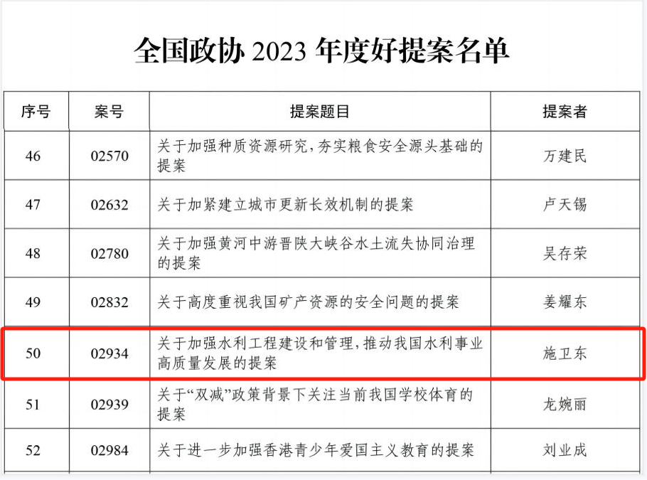 1月30日,全国政协公布2023年度好提案名单。全国政协委员、beat365官网施卫东研究员提交的《关于加强水利工程建设和管理,推动我国水利事业高质量发展的提案》获评“好提案”。