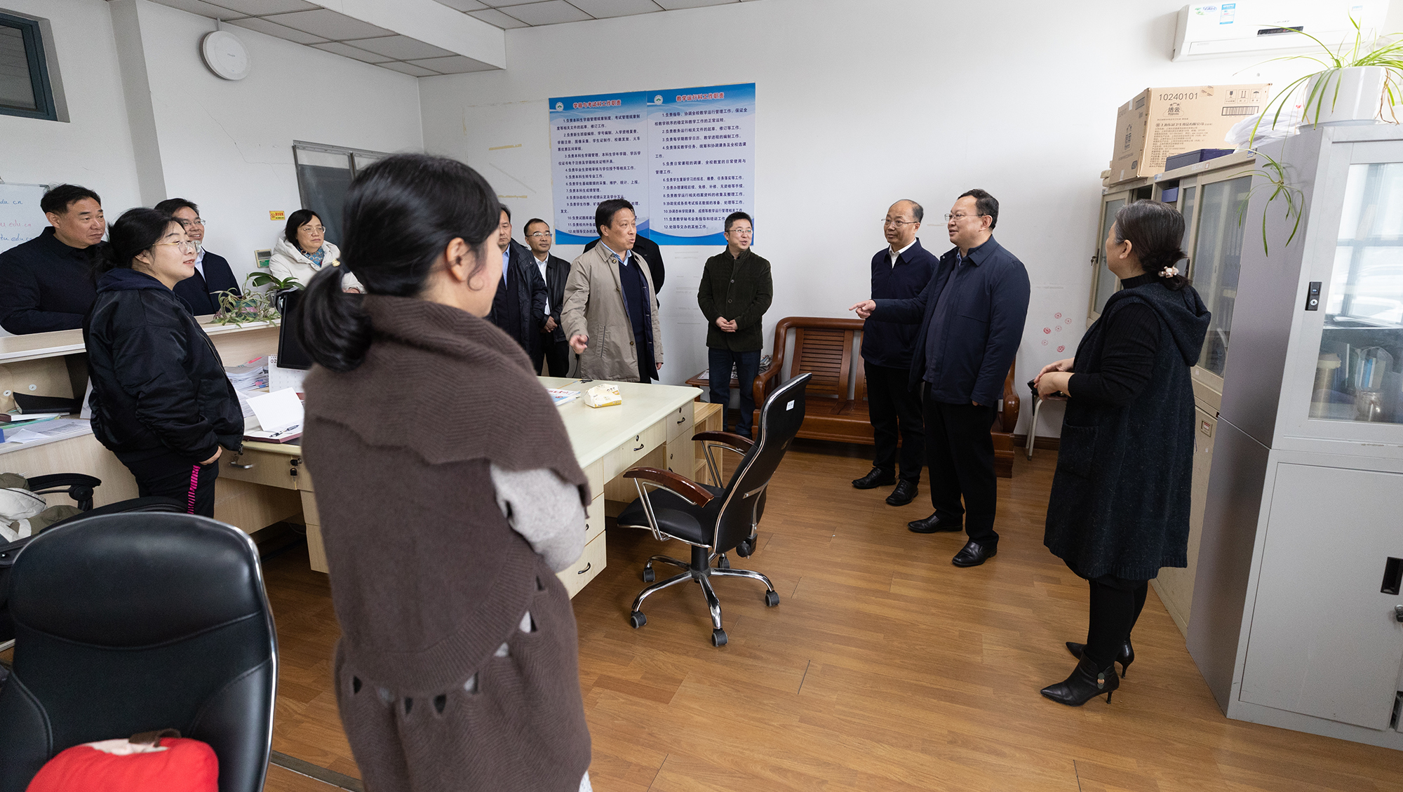 2月19日上午,校党委书记尚庆飞,校党委副书记、校长杨宇民走访各职能部门,亲切看望慰问在岗工作人员。校领导王卫东、陆俊杰、吉明明、施佺、陈玉娟、华亮陪同走访。