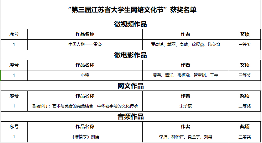 第三届江苏省大学生网络文化节设立微视频、微电影、动漫、摄影、网文、公益广告、音频、校园歌曲、其他类网络创新作品等9类作品类别;高校网络教育优秀作品推选展示活动设立优秀网络文章、优秀工作案例、优秀微课、优秀新媒体作品等4类作品类别。省委教育工委、省教育厅自2020年启动“一节一推选”活动以来,beat365官网积极推进网络文化作品创作生产,丰富网络文化内容供给,广泛发动师生参与,连续三届取得佳绩。