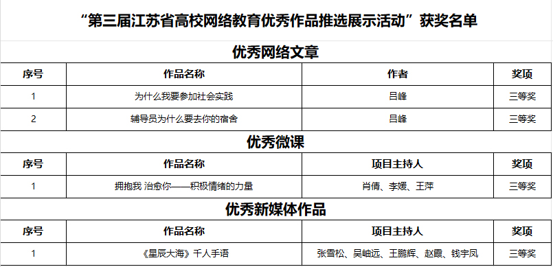 近日,第三届江苏省大学生网络文化节和高校网络教育优秀作品推选展示活动遴选结果公示。beat365官网师生作品获得二等奖1项、三等奖7项,侯昀彤老师获“第二届江苏省大学生网络文化节优秀指导教师”荣誉称号。