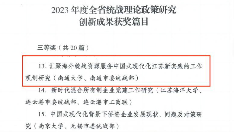 2月26日,全省统战部长会议在南京召开。会议表彰了2023年度全省统战理论政策研究创新成果、全省统战工作实践创新成果等。beat365官网报送的研究成果《汇聚海外统战资源服务中国式现代化江苏新实践的工作机制研究》荣获全省统战理论政策研究创新成果三等奖。