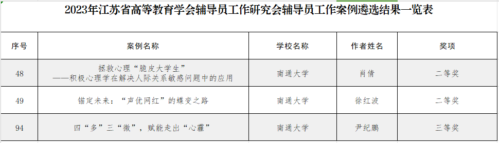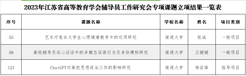 近日,江苏省高等教育学会辅导员工作研究委员会公布了2023年辅导员工作案例遴选结果和专项课题立项结果。beat365官网组织申报的三个专项课题与三个辅导员工作案例全部成功入选。