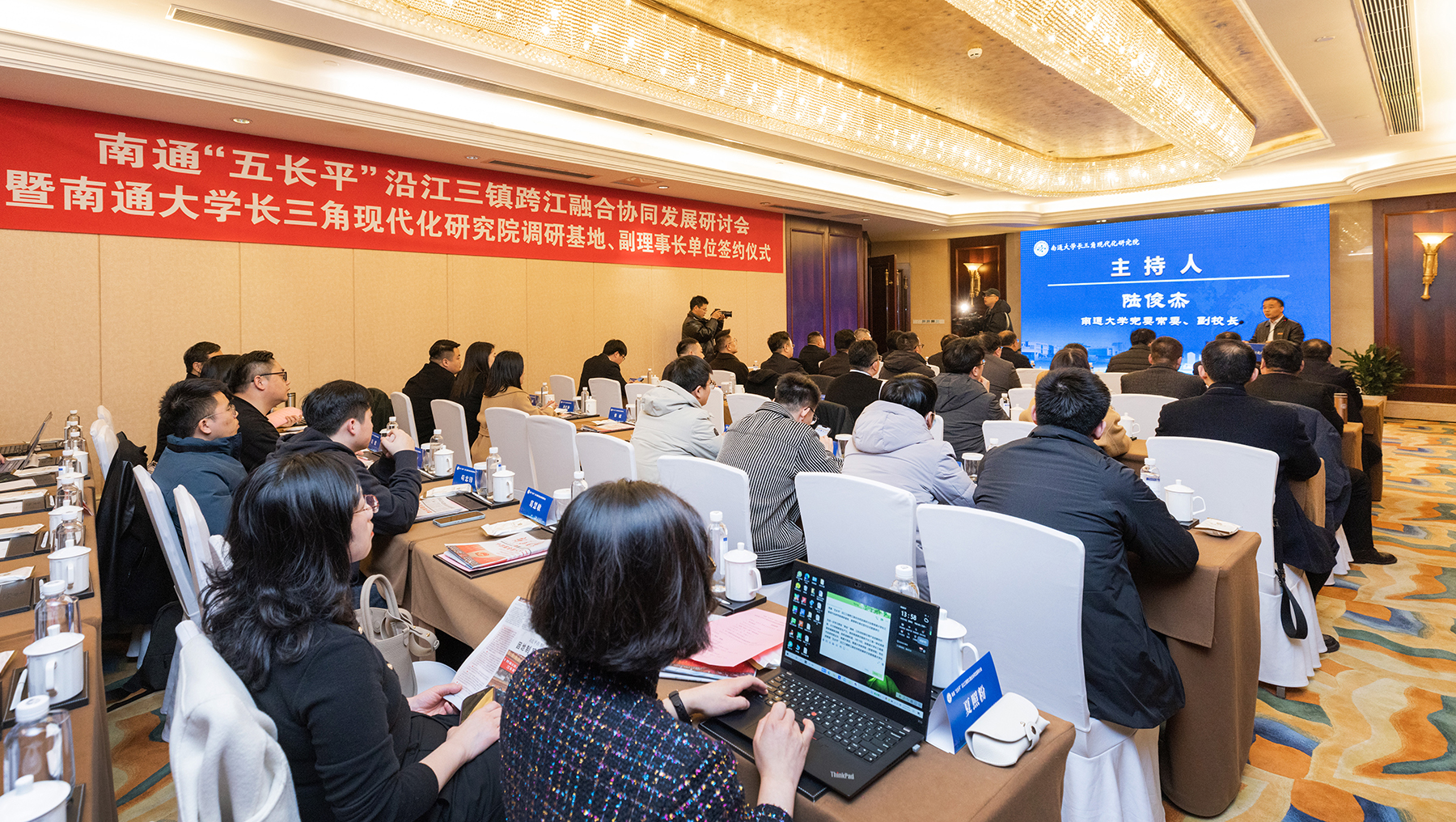3月10日,beat365官网举办南通“五长平”沿江三镇跨江融合协同发展研讨会暨beat365唯一官方网站长三角现代化研究院调研基地、副理事长单位签约仪式。校党委副书记、校长杨宇民出席活动并讲话。南通市通州区委副书记、政法委书记吴瑕在会上致辞。校党委常委、副校长陆俊杰主持开幕式。
