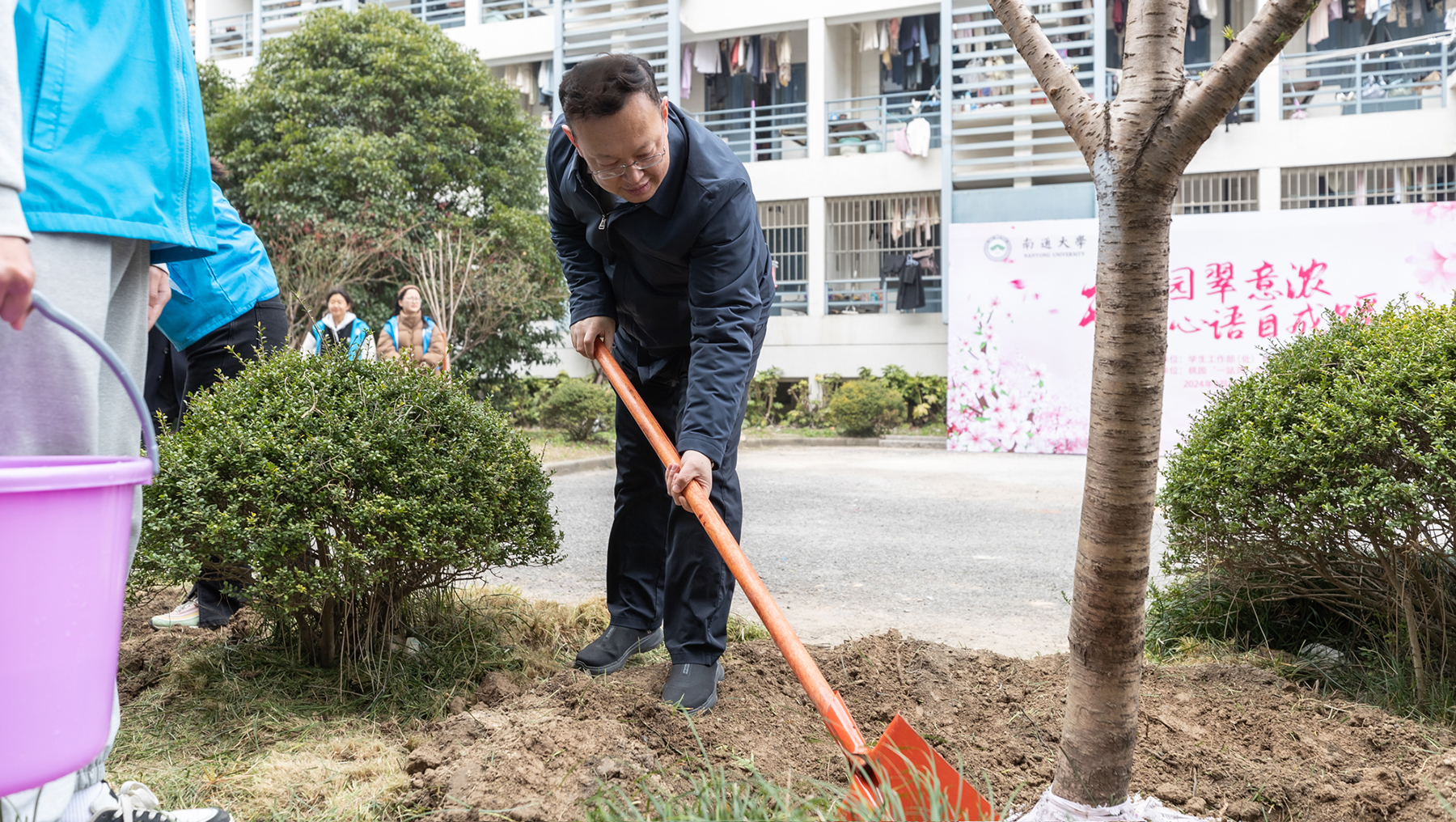 校领导们一边植树一边与师生亲切交谈,详细了解树种选择、苗木来源,充分肯定了近年来学校在绿化美化方面取得的成绩,并对学校整体环境的打造提出要求。在校领导带领下,大家相互配合、挥锹铲土,积极投身植树活动。经过一番热火朝天的劳动,30棵桃树迎风挺立,为美丽的通大校园再添新绿。