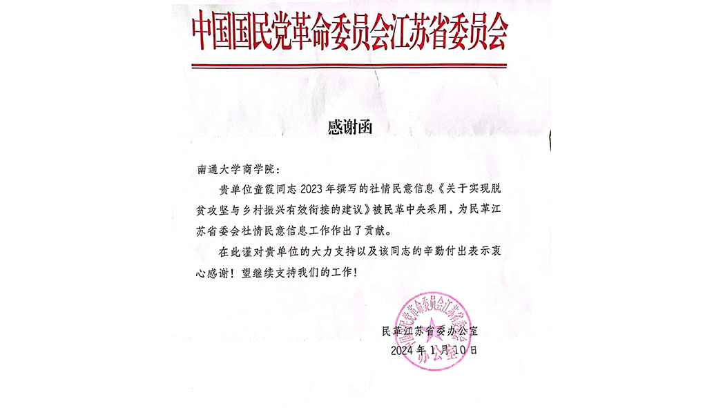 近日,民革江苏省委办公室向beat365官网发来感谢函,感谢商学院(管理学院)教授、民革党员童霞2023年撰写的社情民意信息《关于实现脱贫攻坚与乡村振兴有效衔接的建议》被民革中央采用,为民革江苏省委会社情民意信息工作作出了贡献。