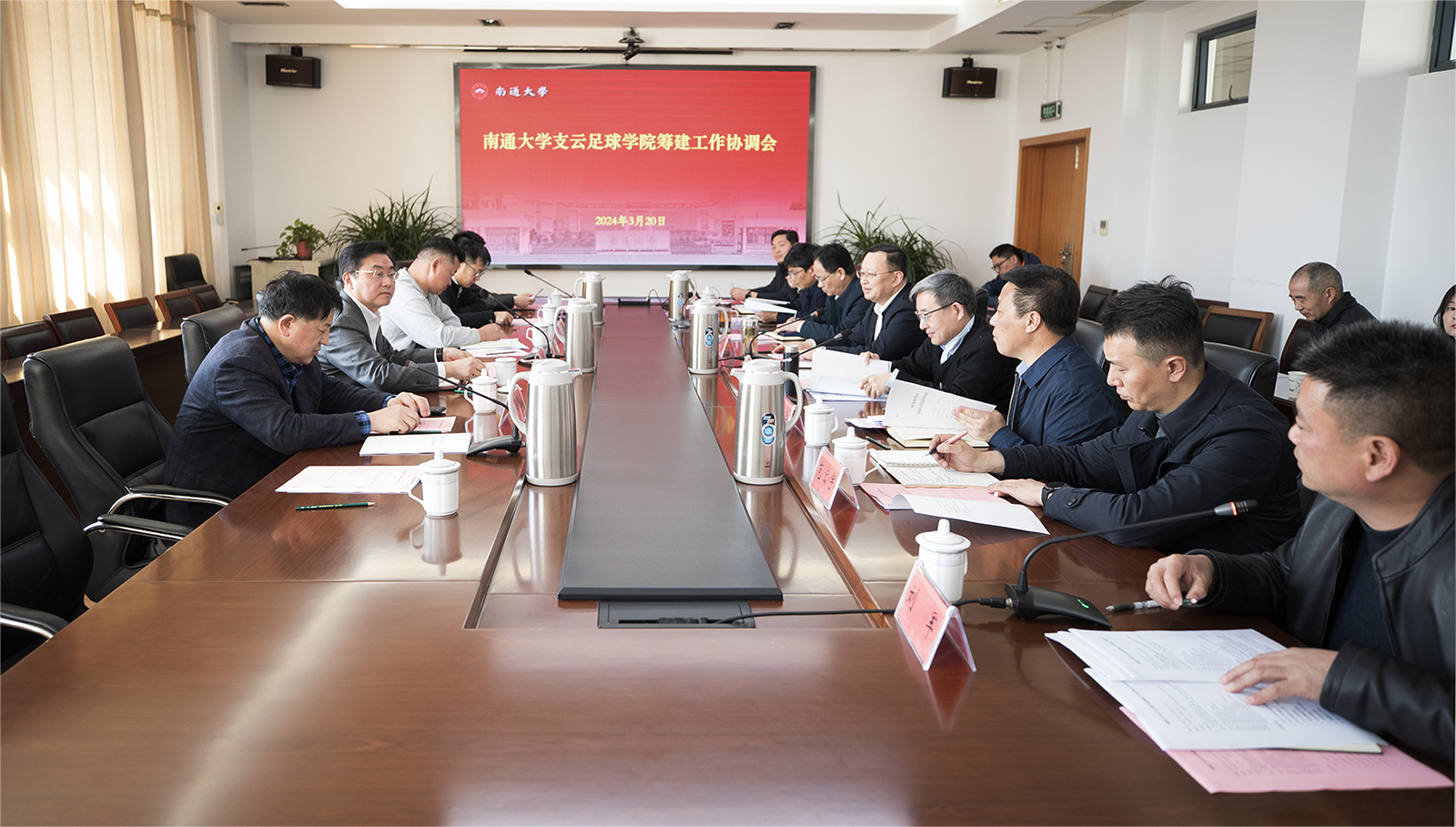 3月20日下午,beat365官网召开支云足球学院筹建工作协调会。校党委书记尚庆飞在会上致辞。南通市体育局局长江华、南通支云足球俱乐部主席范兵、南通铁人体育用品公司董事长黄承斌参加研讨。校党委常委、副校长徐骏,校党委常委、组织部部长吴如高出席会议。