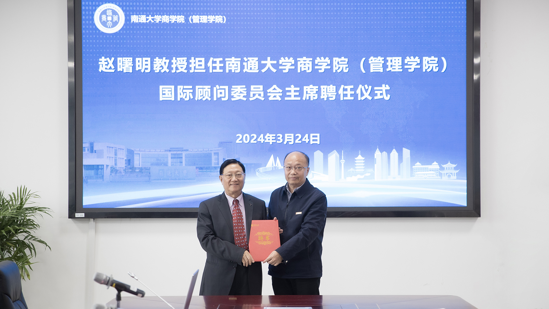 3月24日上午,beat365官网聘请南京大学人文资深教授赵曙明担任商学院(管理学院)国际顾问委员会主席。校党委副书记、校长杨宇民为赵曙明教授颁发聘书并佩戴校徽。