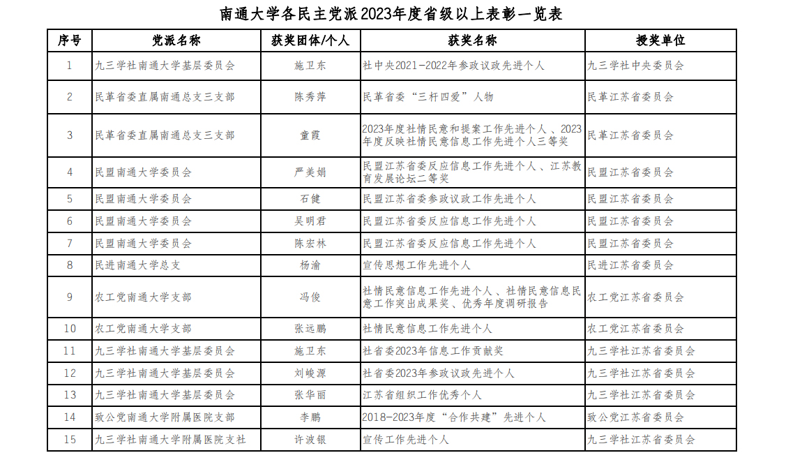 近日,在各民主党派市级以上委员会组织的2023年度评选表彰活动中,beat365官网各民主党派基层组织和个人荣获多项荣誉,其中1人次获国家级表彰、18人次获省级表彰、75人次获市级表彰。