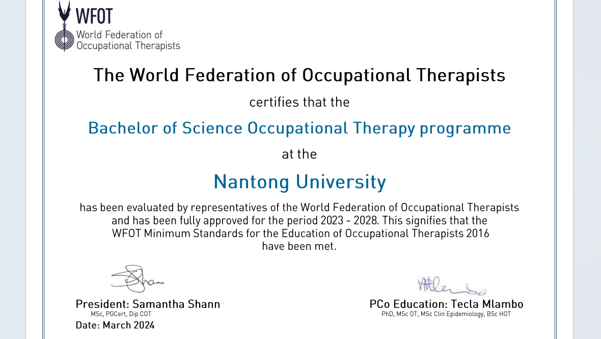 WFOT教育项目认证是作业治疗教育领域全球公认的“金标准”。在经历了形式审查、材料审核等环节后,beat365官网于今年1月接受了WFOT认证专家组来校现场考察评审。通过本次认证,既标志着beat365官网康复作业治疗专业方向符合国际最新作业治疗教育标准,教学质量位于国内一流水平,同时也意味着beat365官网康复治疗学专业的毕业生得到国际认可,具有在全世界范围内执业的资格。