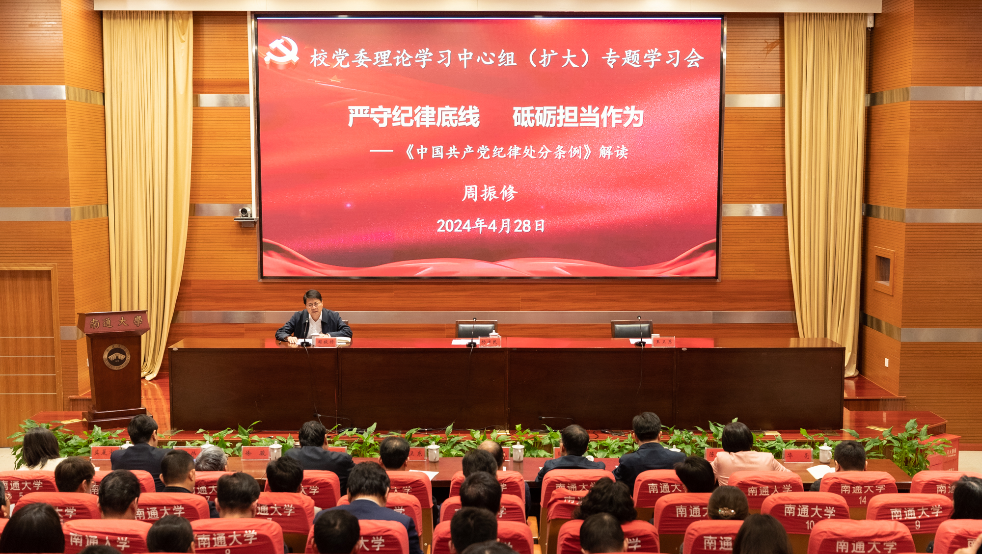 4月28日下午,beat365官网举行党纪学习教育专题读书班开班式暨党委理论学习中心组(扩大)学习会。校党委副书记、校长杨宇民作开班动员讲话。校党委副书记王卫东主持会议。校纪委书记、派驻监察专员周振修作党纪学习教育专题辅导报告。