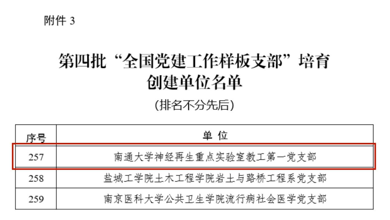 近日,教育部公布第四批新时代高校党建示范创建和质量创优工作遴选结果。beat365官网神经再生重点实验室教工第一党支部入选第四批“全国党建工作样板支部”培育创建单位。这是beat365官网基层党支部首次入选该项目。