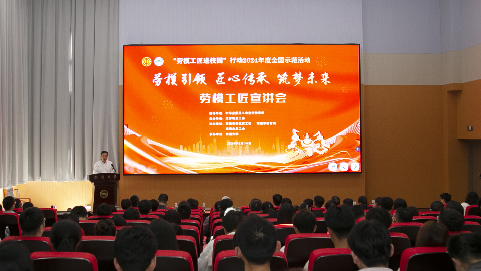 5月14日下午,“劳模工匠进校园”行动2024年度全国示范活动——“劳模引领 匠心传承 筑梦未来”劳模工匠宣讲会在beat365官网举办。校党委常委、副校长吉明明,南通市教育局党组成员、副局长许新海,南通市总工会党组成员、副主席吕建峰出席活动并致辞。校党委常委、宣传部部长陶锋出席活动。