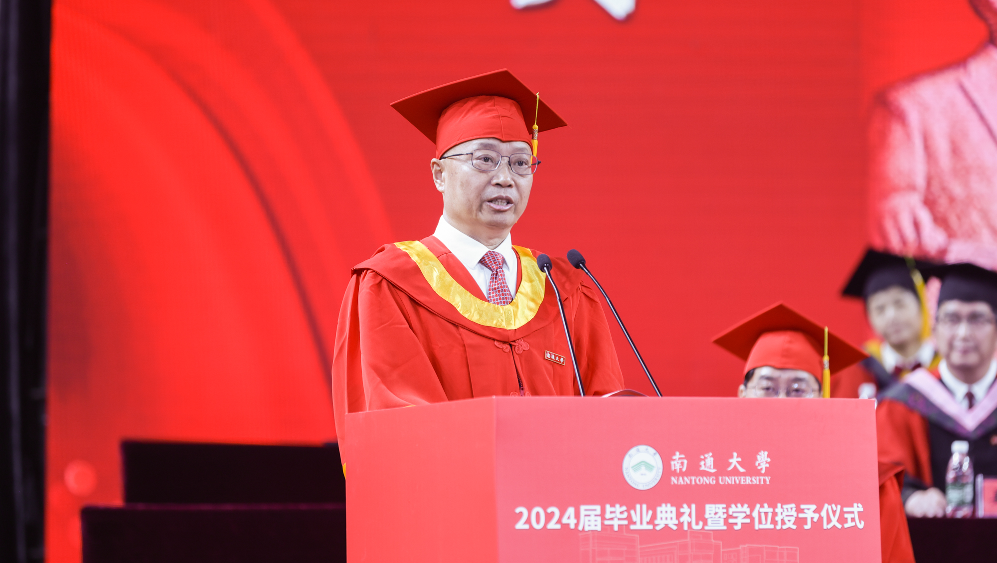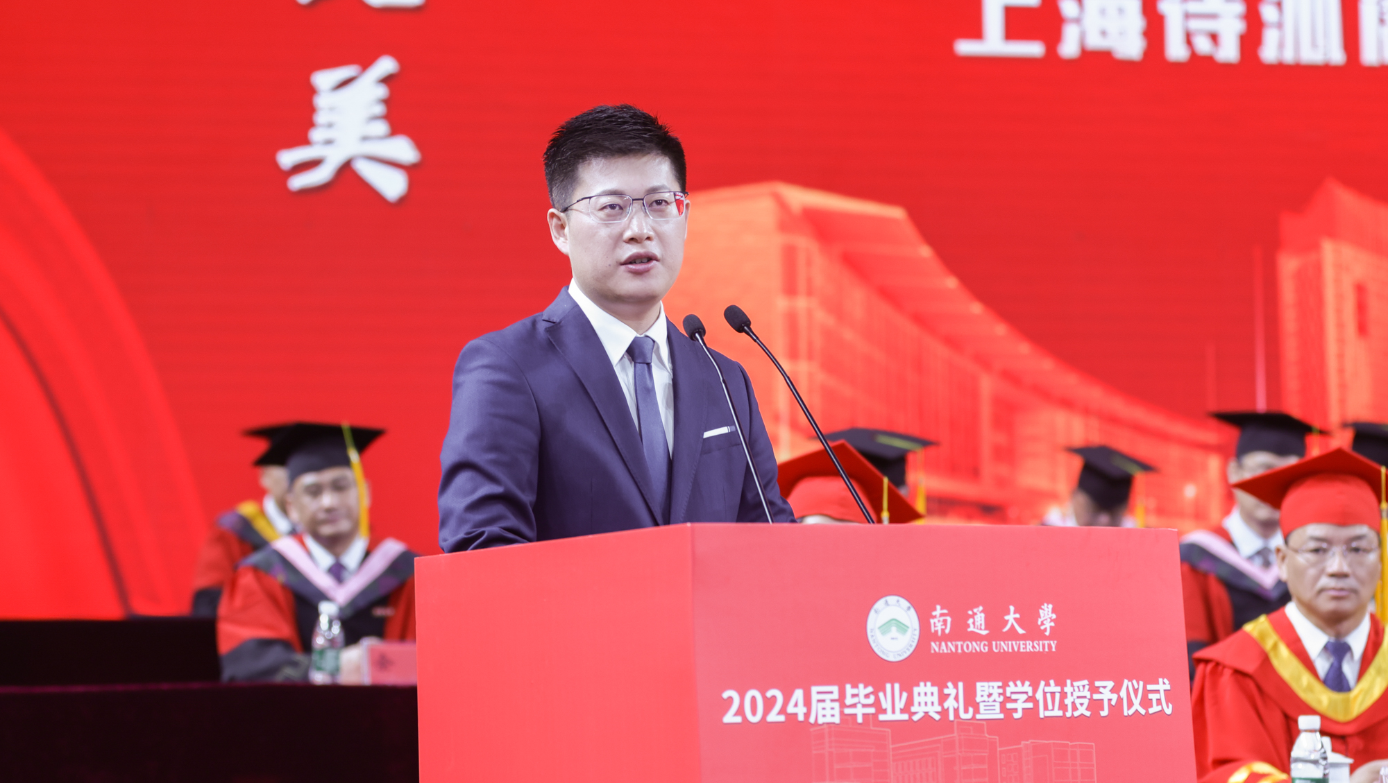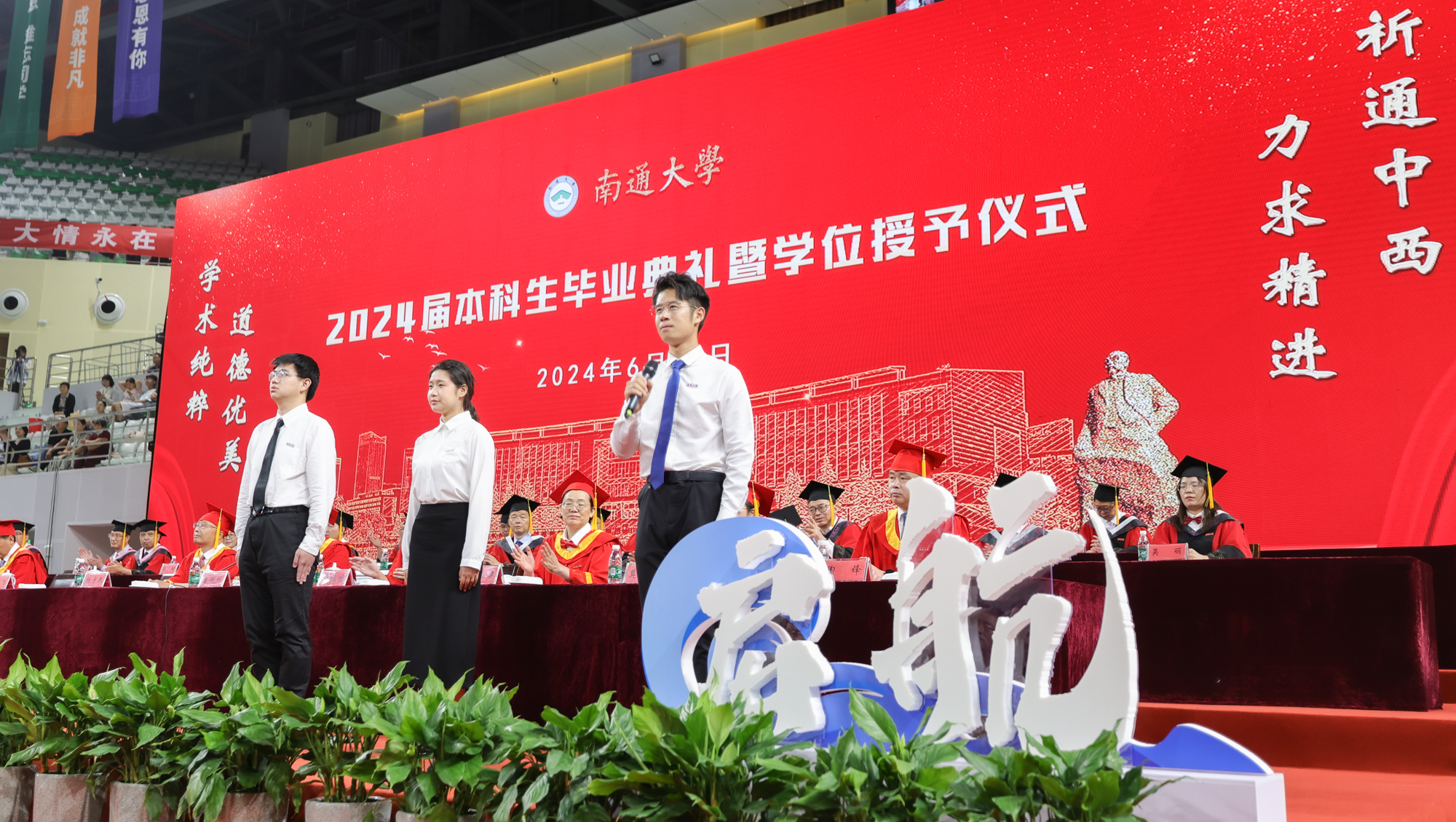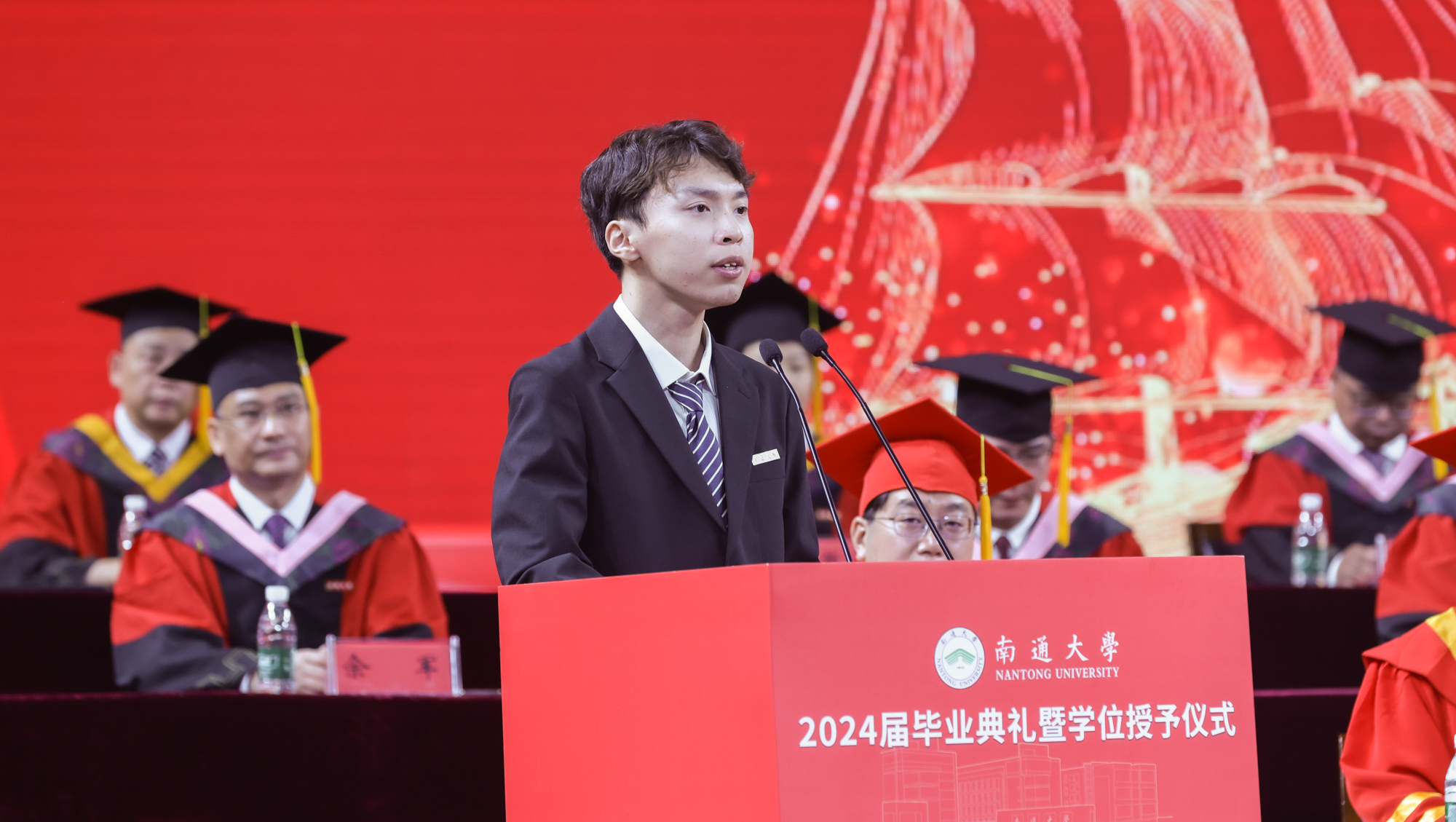 张謇学院计算机科学与技术专业201班徐权杰作为2024届本科毕业生代表发言。他深情回顾了自己在通大的四年成长历程,并代表全体毕业生向母校的师长、同学表达最真挚的感谢。他号召全体毕业生,带着“今天我以母校为荣,明天母校以我为傲”的抱负和梦想,牢记“通大人”的身份,以坚定的“通大自信”、笃实的“通大行动”、卓越的“通大精神”,踔厉奋发、勇毅前行,在中国式现代化的火热实践中绽放绚丽之花,走出与时代同呼吸、与祖国共前进的非凡之路。