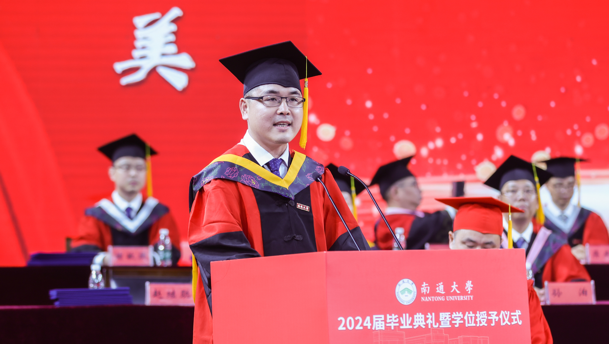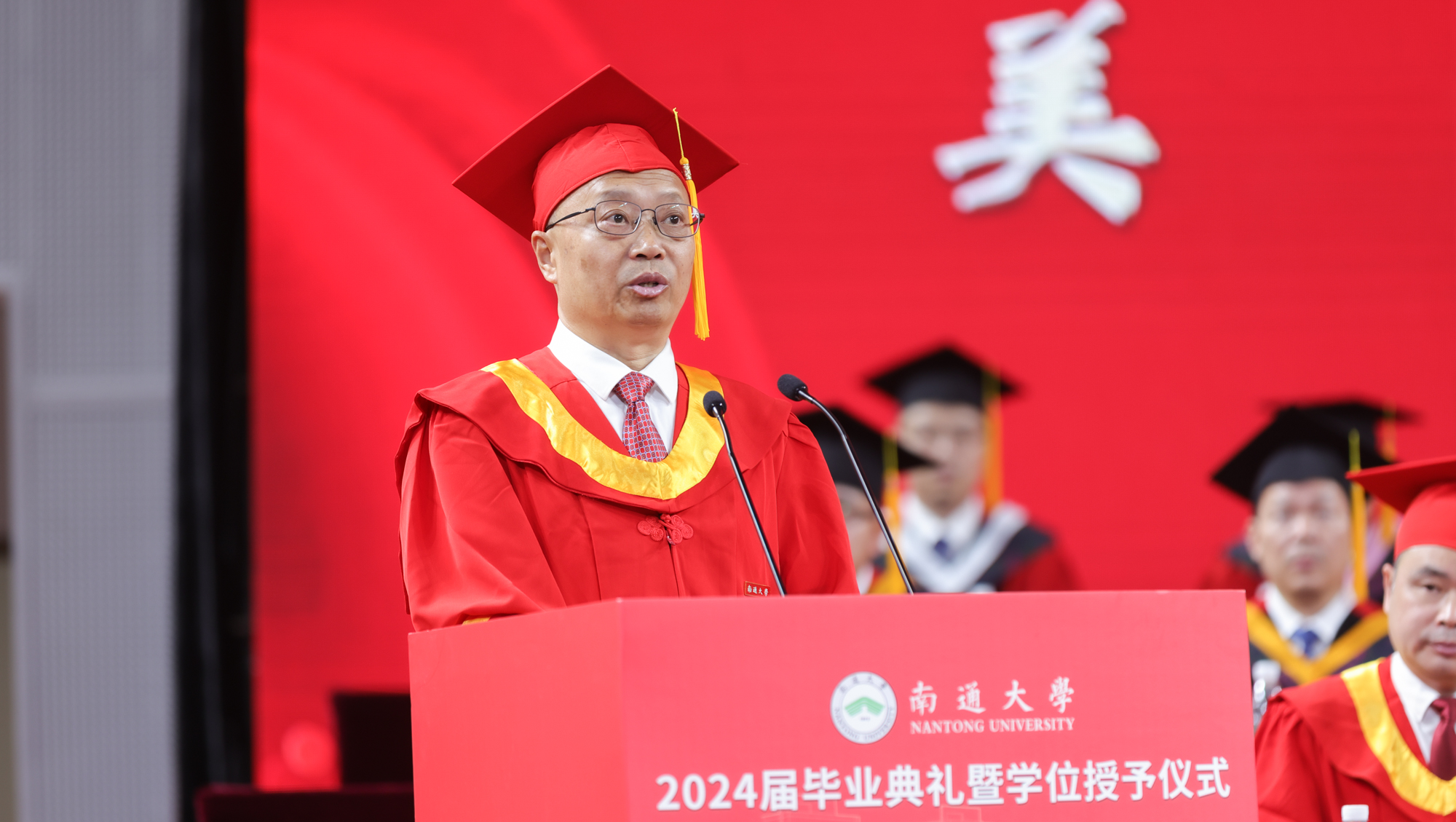 仪式在雄壮的国歌声中拉开帷幕。校党委副书记、校长杨宇民代表学校,向顺利完成学业的全体研究生表示热烈祝贺,向辛勤培育研究生成长成才的老师和家长们致以崇高敬意和衷心感谢。他表示,同学们在通大的时光里勤奋学习,勇于探索,锤炼了品德修养、夯实了专业基础、学会了做人处事,用辛勤付出和优异成绩书写了新时代青年人的责任担当,展现了通大研究生的优秀品质。他指出,同学们即将正式步入社会与国家的建设者行列,肩负起运用所学回馈社会、以才智报效祖国的崇高使命,希望同学们一要坚定理想信念,胸怀报国之志,多思考“我能为国家做些什么,我能为社会做些什么”,把个人理想融入时代洪流,把青春、才华和热情投入到为更多人谋幸福的伟大事业中;二要锤炼过硬本领,勇担强国之任,做到精益求精、尽善尽美,敢于争先、追求卓越,努力成为知识创造和社会进步的引领者;三要坚守大爱情怀,永葆善良本真,以实际行动和闪光品质,传播真善美、传递正能量,用平常心做不平常事、用小爱凝聚大爱,影响更多身边人向上向善。他祝愿同学们怀揣报国之志,以初心为舵、勇气为帆、爱心为桨,勇敢地驶向人生的大海,创造属于自己的辉煌篇章。