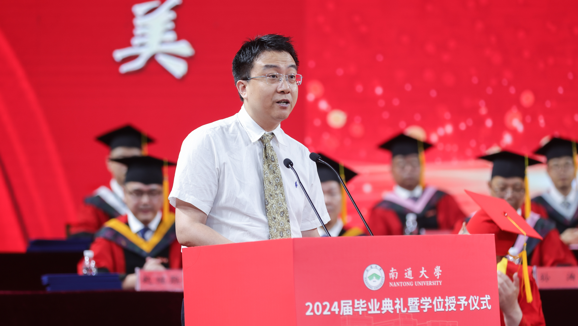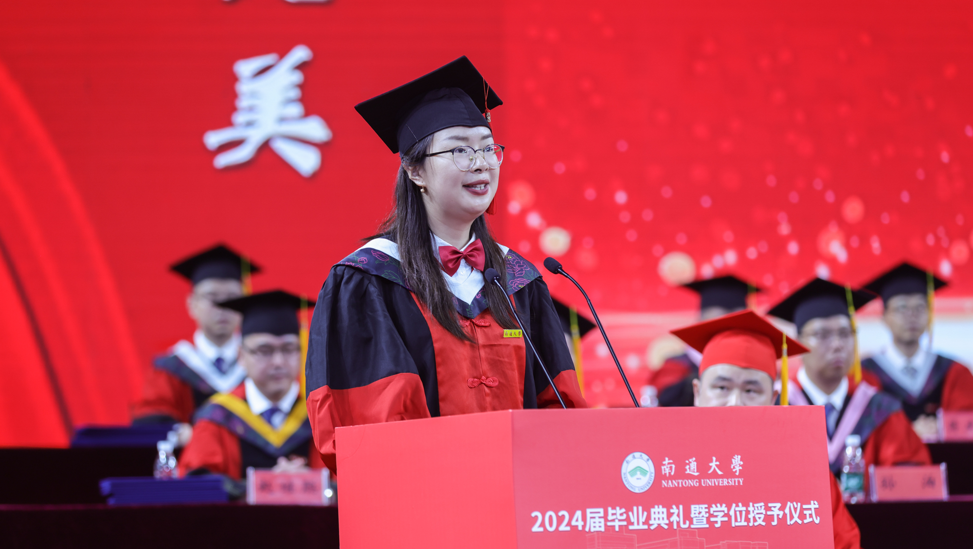 医学院博士研究生黄月皎作为毕业生代表发言,回顾了在通大求学的奋斗时光,表示通大是她漫漫十余载求学路上最坚定、最无悔的选择。她说,“道德优美,学术纯粹”的价值追求早已深入其骨髓,未来也一定砥砺前行、不负韶华,以毕生精力奉献医学事业,把学术论文写在祖国大地上。