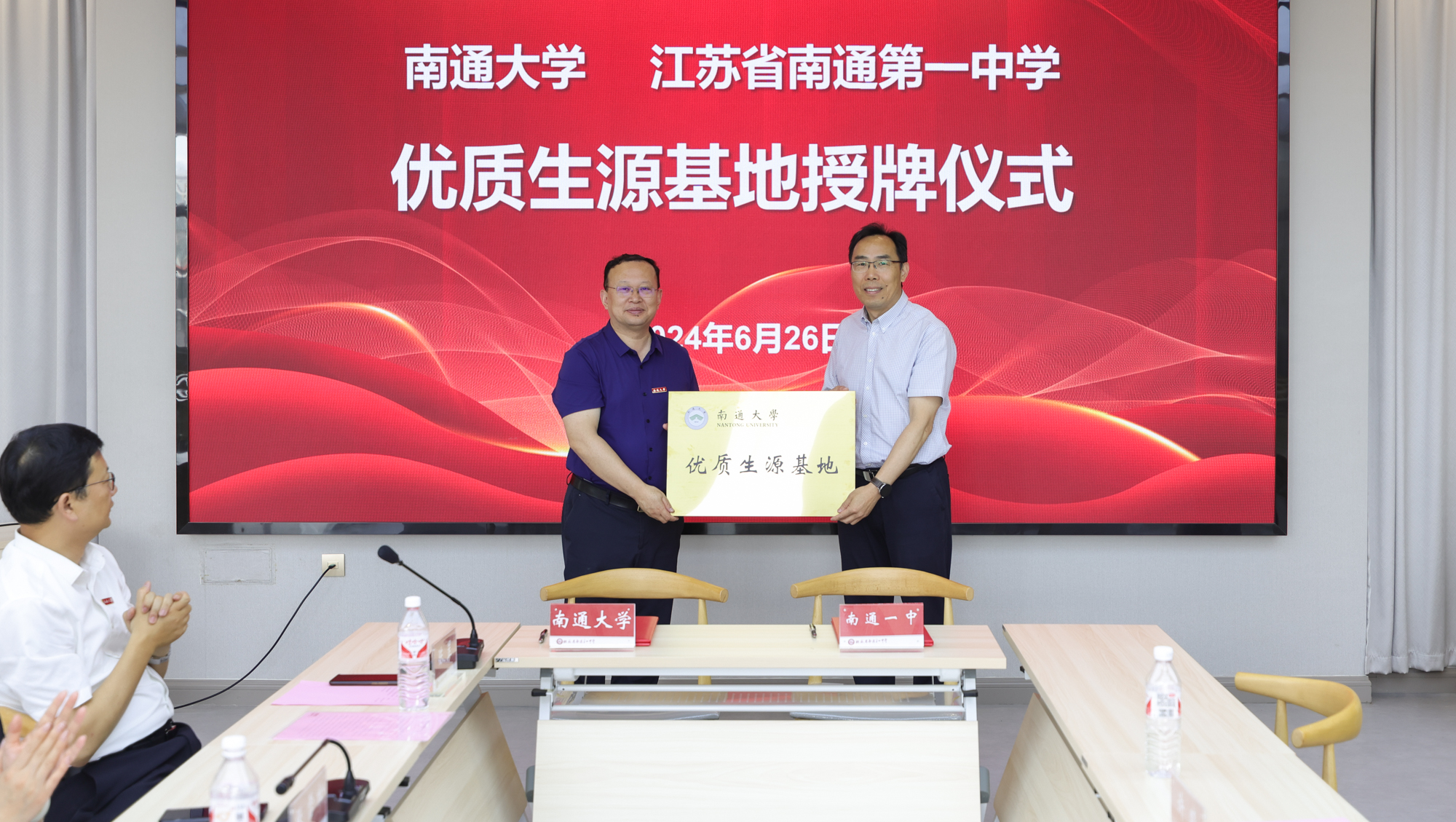 6月26日上午,beat365官网与江苏省南通第一中学举行优质生源基地签约授牌仪式。校党委书记尚庆飞代表学校向江苏省南通第一中学授牌。校党委常委、副校长吉明明,江苏省南通第一中学党委书记张晓冰代表双方签署《优质生源基地建设协议书》。