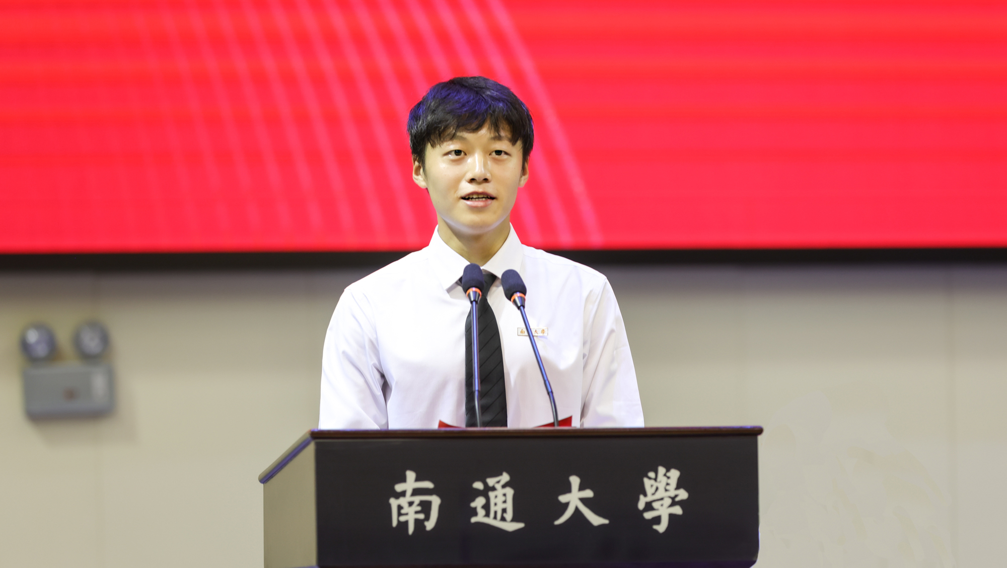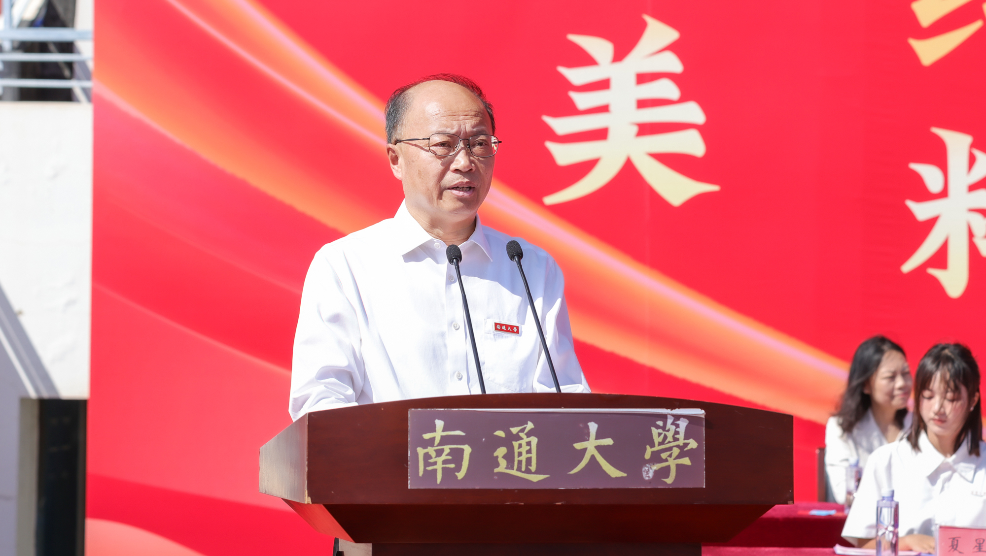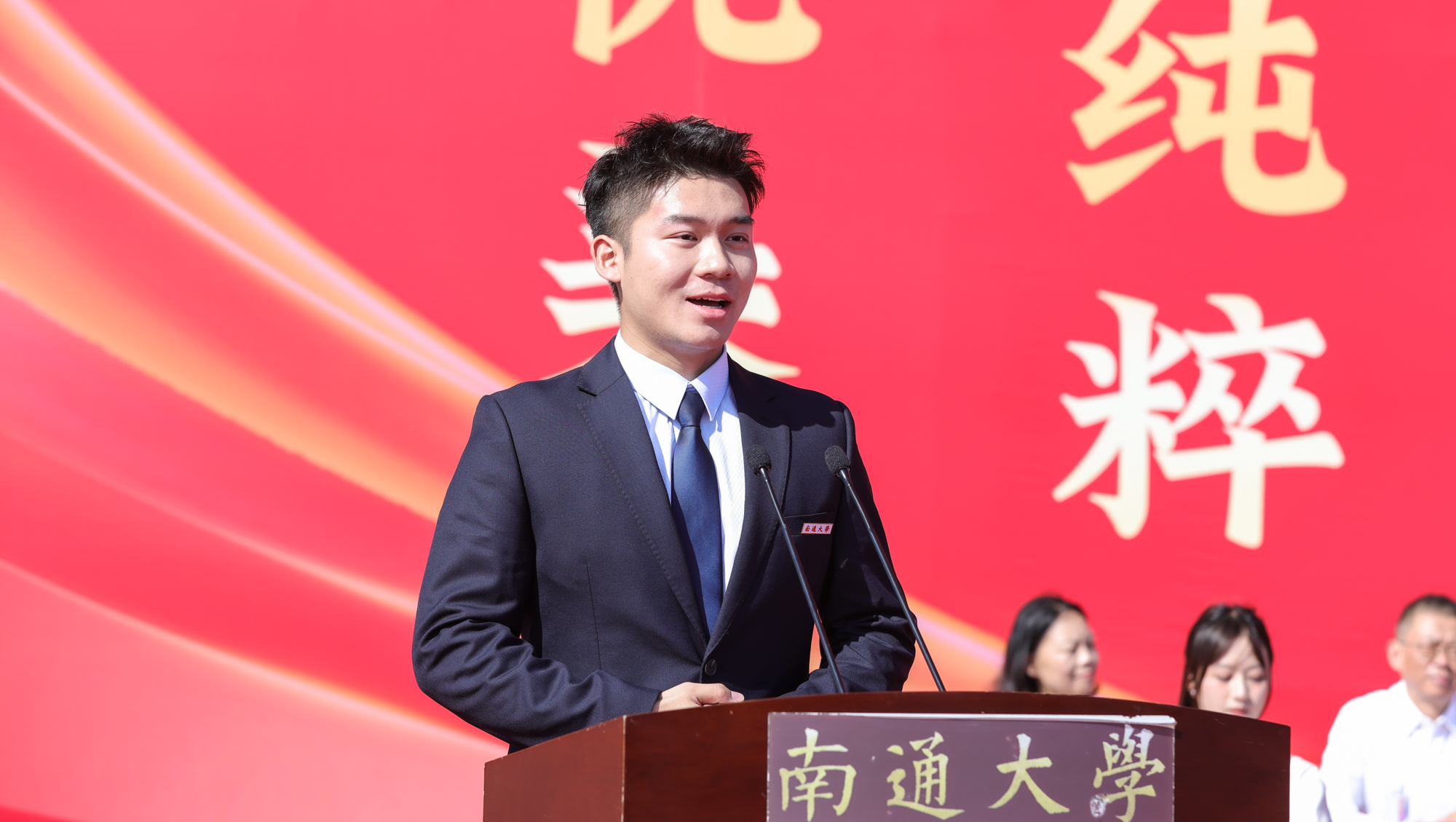 校友代表、启东中学党委书记、校长陈仲刘,家长代表蔡鑫桦校友分别在典礼上发言。陈仲刘深情回忆了在通大学习生活的点滴,并以“用热爱成就美好”的职业生涯经历寄语学弟学妹要珍惜太平盛世,常怀感恩之心,以热情去追逐梦想,以执着去成就未来,以真爱去温暖他人。蔡鑫桦分享了求学和工作经历,感恩母校的辛勤培育和老师的谆谆教诲,希望学弟学妹们找到学习的意义,抓住一切机会努力提升综合素养,做到志存高远,胸怀梦想;勤勉学习,不负韶华;开阔视野,丰富自我。