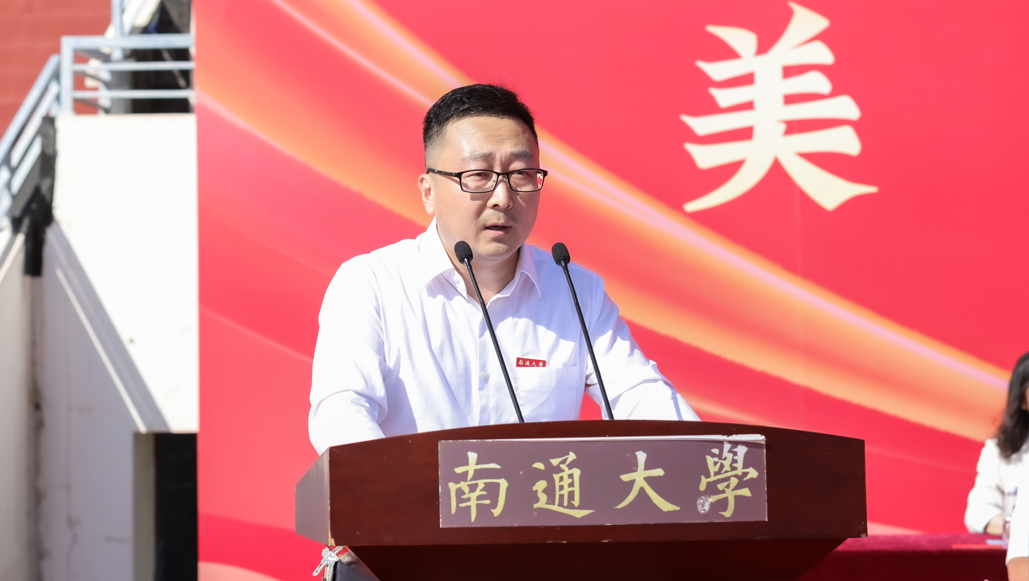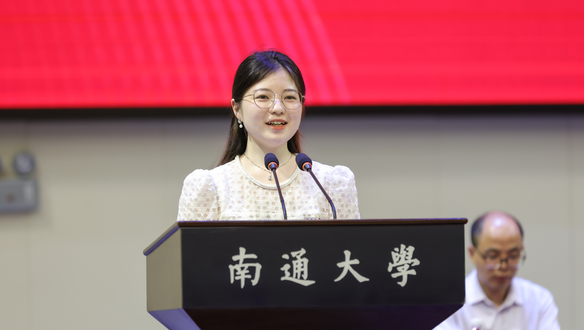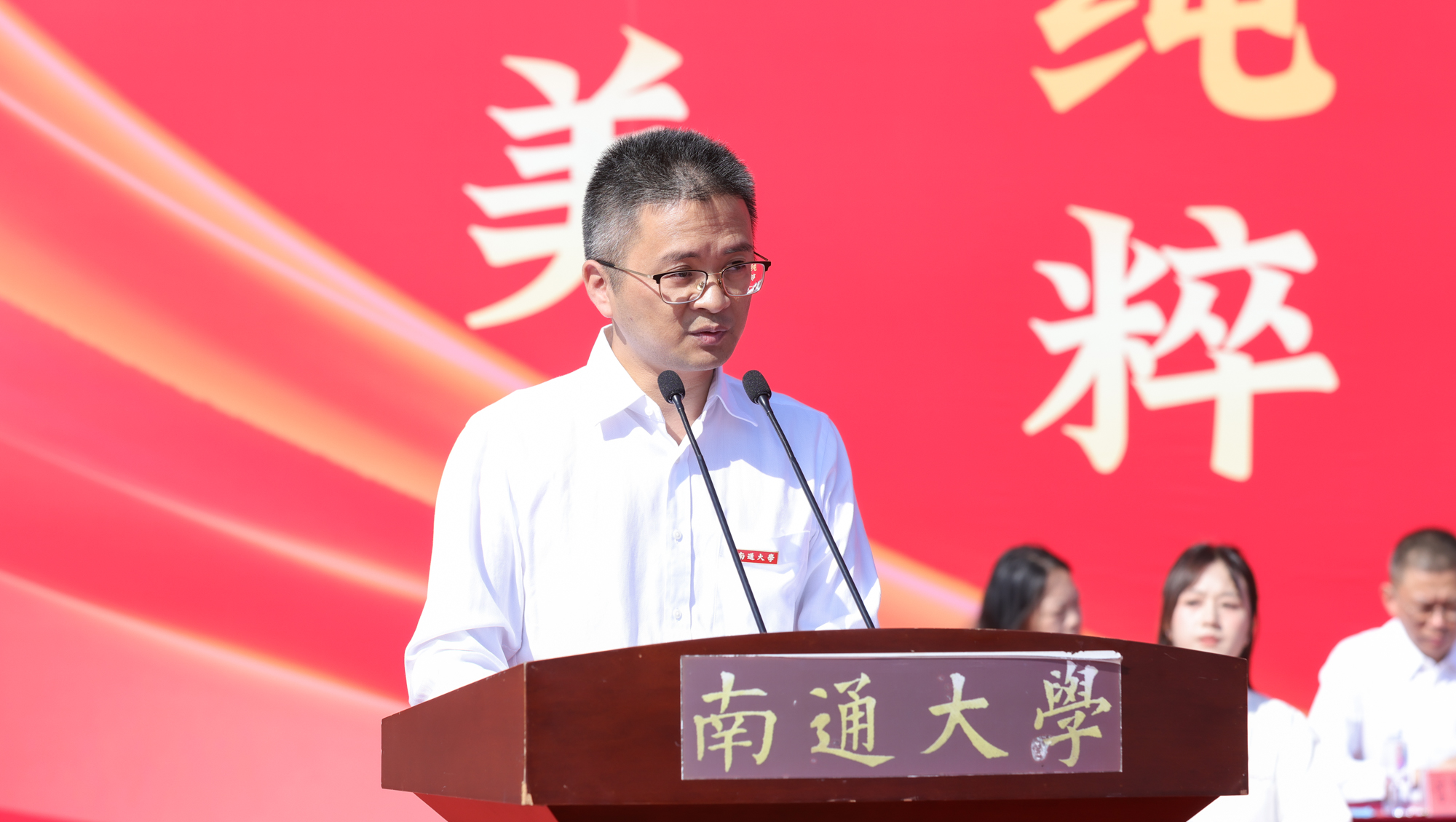 校友代表、启东中学党委书记、校长陈仲刘,家长代表蔡鑫桦校友分别在典礼上发言。陈仲刘深情回忆了在通大学习生活的点滴,并以“用热爱成就美好”的职业生涯经历寄语学弟学妹要珍惜太平盛世,常怀感恩之心,以热情去追逐梦想,以执着去成就未来,以真爱去温暖他人。蔡鑫桦分享了求学和工作经历,感恩母校的辛勤培育和老师的谆谆教诲,希望学弟学妹们找到学习的意义,抓住一切机会努力提升综合素养,做到志存高远,胸怀梦想;勤勉学习,不负韶华;开阔视野,丰富自我。