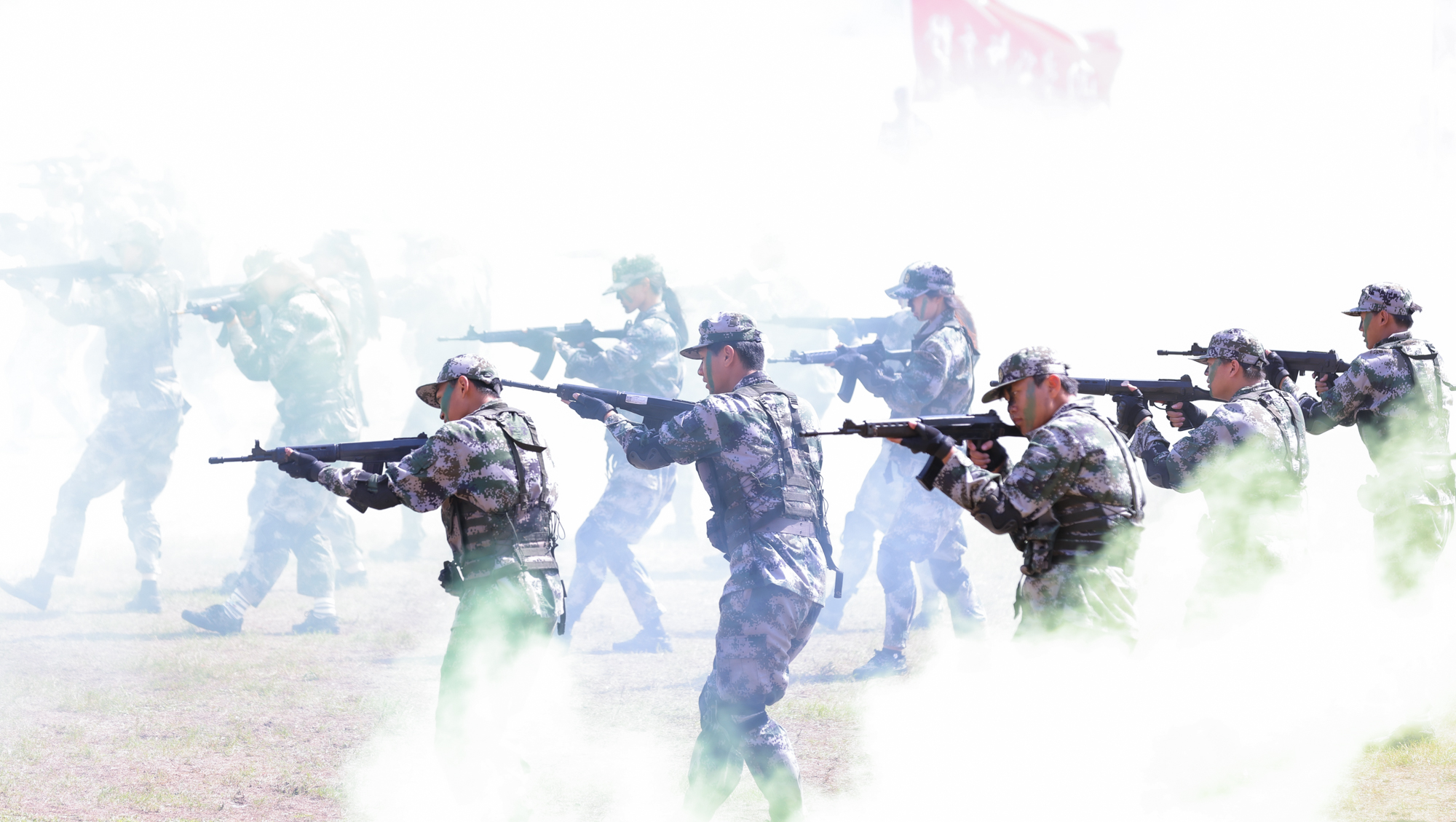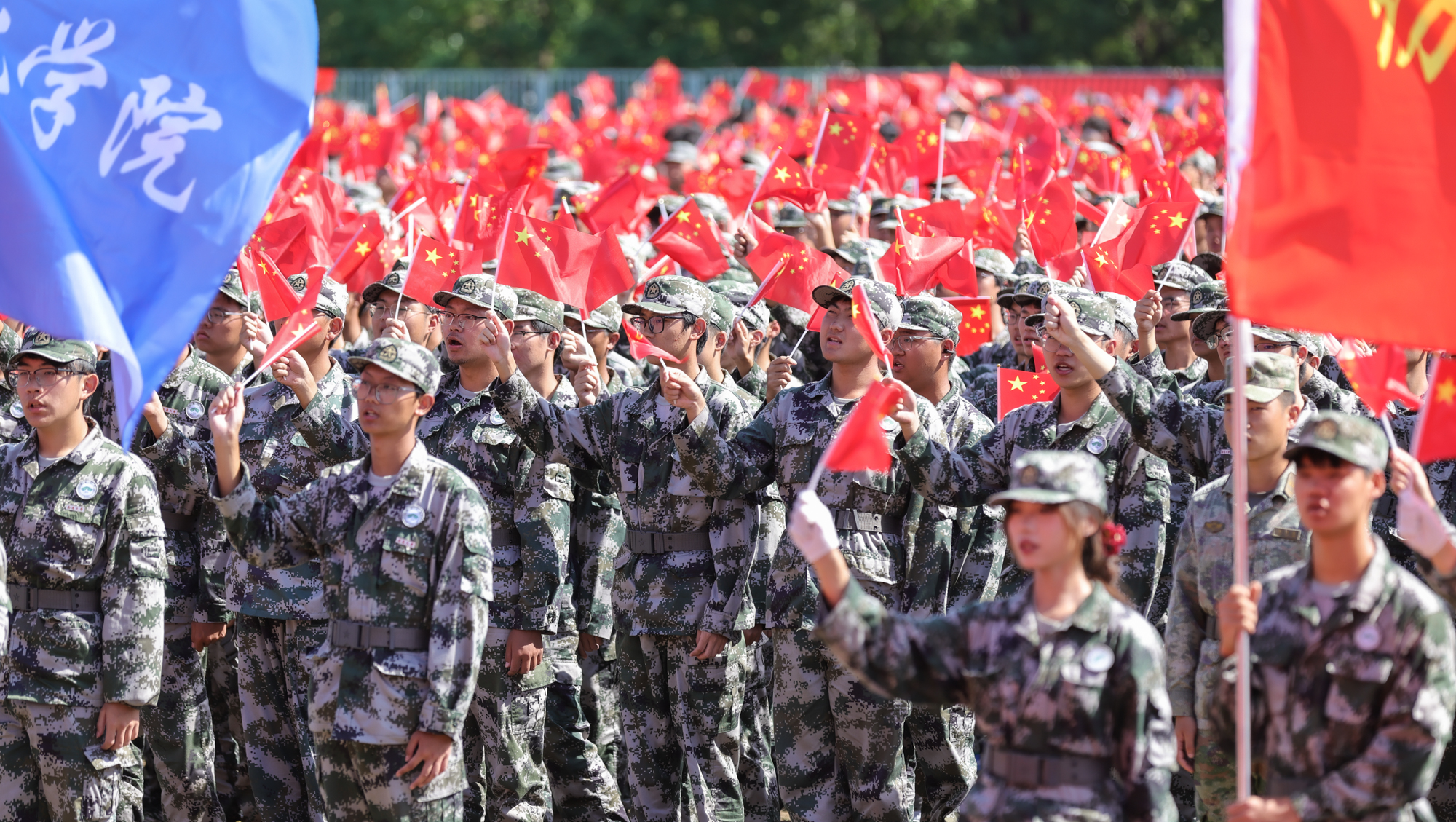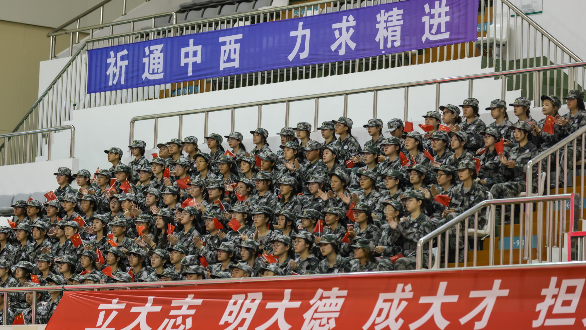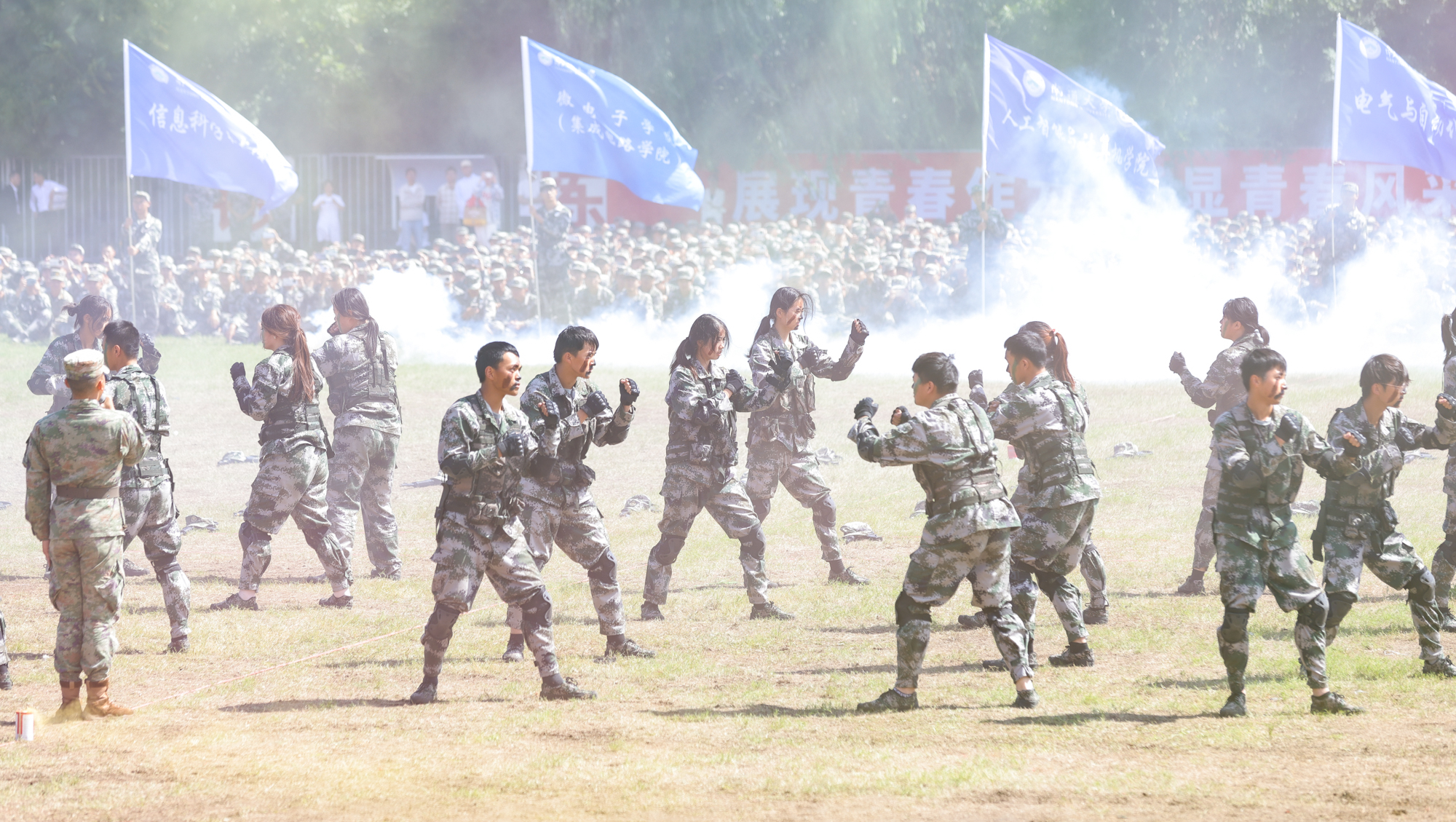 伴随着激昂的进行曲,各军训方阵步伐整齐、口号嘹亮,同学们士气高昂、军姿严整。花样方阵列队表演创意新颖,先后“绘制”出党徽、国旗、校徽等图案,以及“beat365唯一官方网站”“祈通中西”“力求精进”等字样,表达爱党爱国爱校的情怀。战术演练方队展示了立姿、坐姿和仰姿持枪,以及一路队形、前三角队形、后三角队形等,出拳虎虎生威,踢腿凌厉有力,展现了全体新生的勃勃生机。