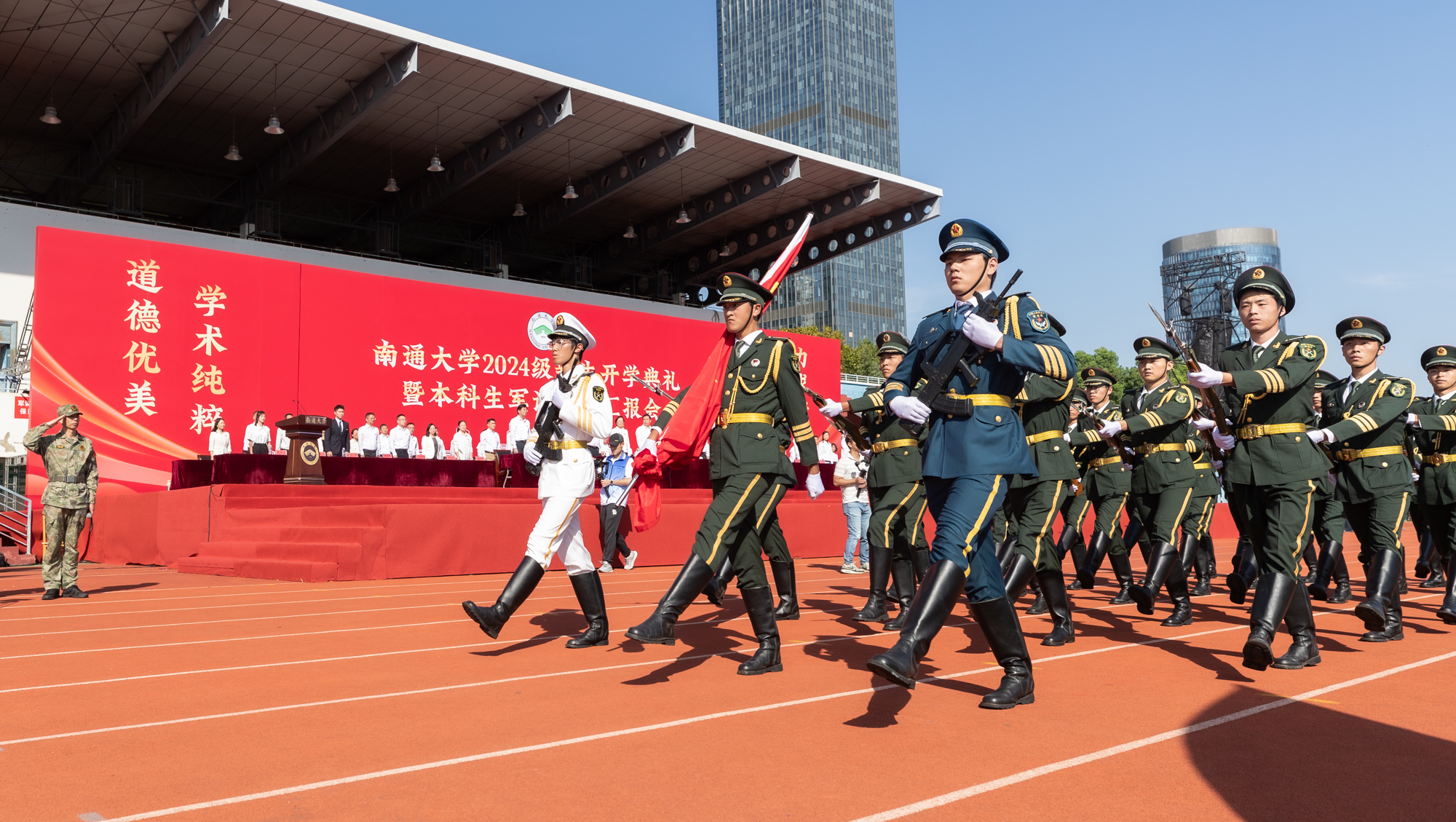 9月20日、22日,beat365官网2024级新生开学典礼分别在啬园校区、启东校区举行。来自全国各地的8576名本科生、2105名研究生新生戴上校徽,正式成为一名通大人。校党委书记尚庆飞出席典礼。校党委副书记、校长杨宇民在典礼上讲话。在通校领导、党委常委共同为新生代表佩戴校徽。校党委常委、副校长吉明明主持典礼。