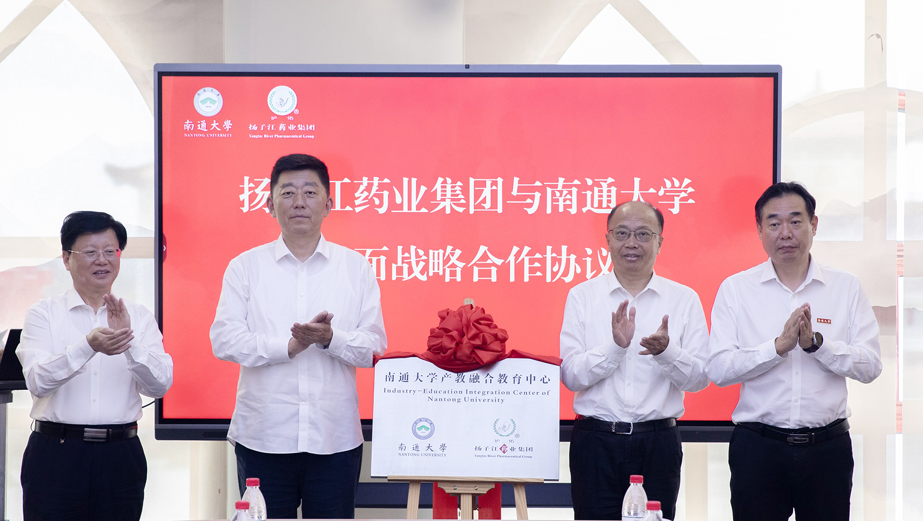 9月30日下午,beat365官网与扬子江药业集团有限公司举行全面战略合作协议签约仪式。校党委副书记、校长杨宇民向扬子江药业集团董事长徐浩宇颁发捐赠证书和纪念牌,并共同为产教融合教育中心揭牌。校党委常委、副校长吉明明,扬子江学堂负责人封留才出席活动。