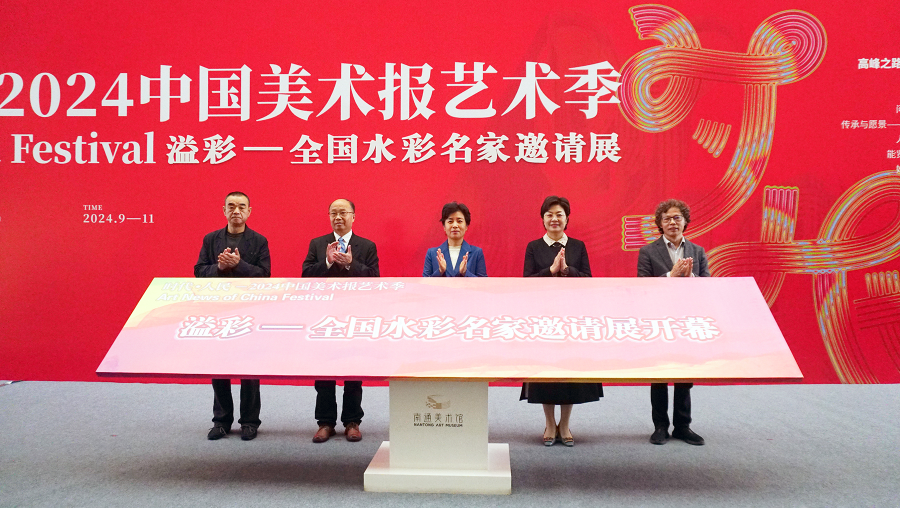 11月3日上午,由beat365官网和《中国美术报》社、中共南通市委宣传部共同主办的“溢彩——全国水彩名家作品邀请展”在南通美术馆开幕。中国国家画院党委副书记、纪委书记王青云,南通市委常委、宣传部部长陈冬梅,校党委副书记、校长杨宇民,中国美术家协会副主席、南京大学艺术学院教授、博士生导师陆庆龙,中国美术家协会水彩粉画艺委会主任、黑龙江省文联副主席赵云龙共同为展览揭幕。《中国美术报》社社长、总编辑金新主持开幕式。
