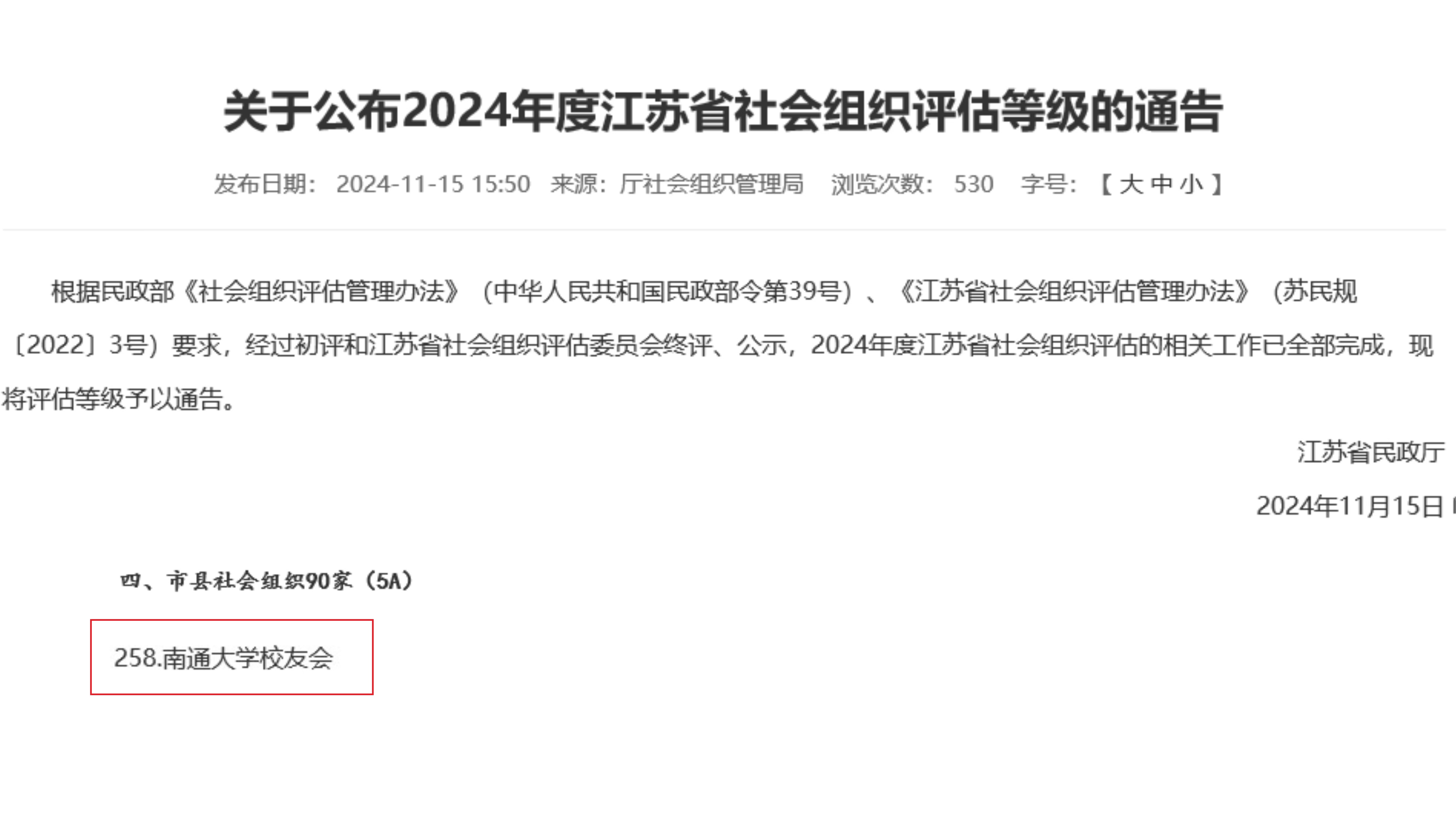 近日,江苏省民政厅发布《关于公布2024年度江苏省社会组织评估等级的通告》。beat365唯一官方网站校友会获评最高等级荣誉“5A级社会组织”,为本年度全省唯一一家获此殊荣的高校校友会。