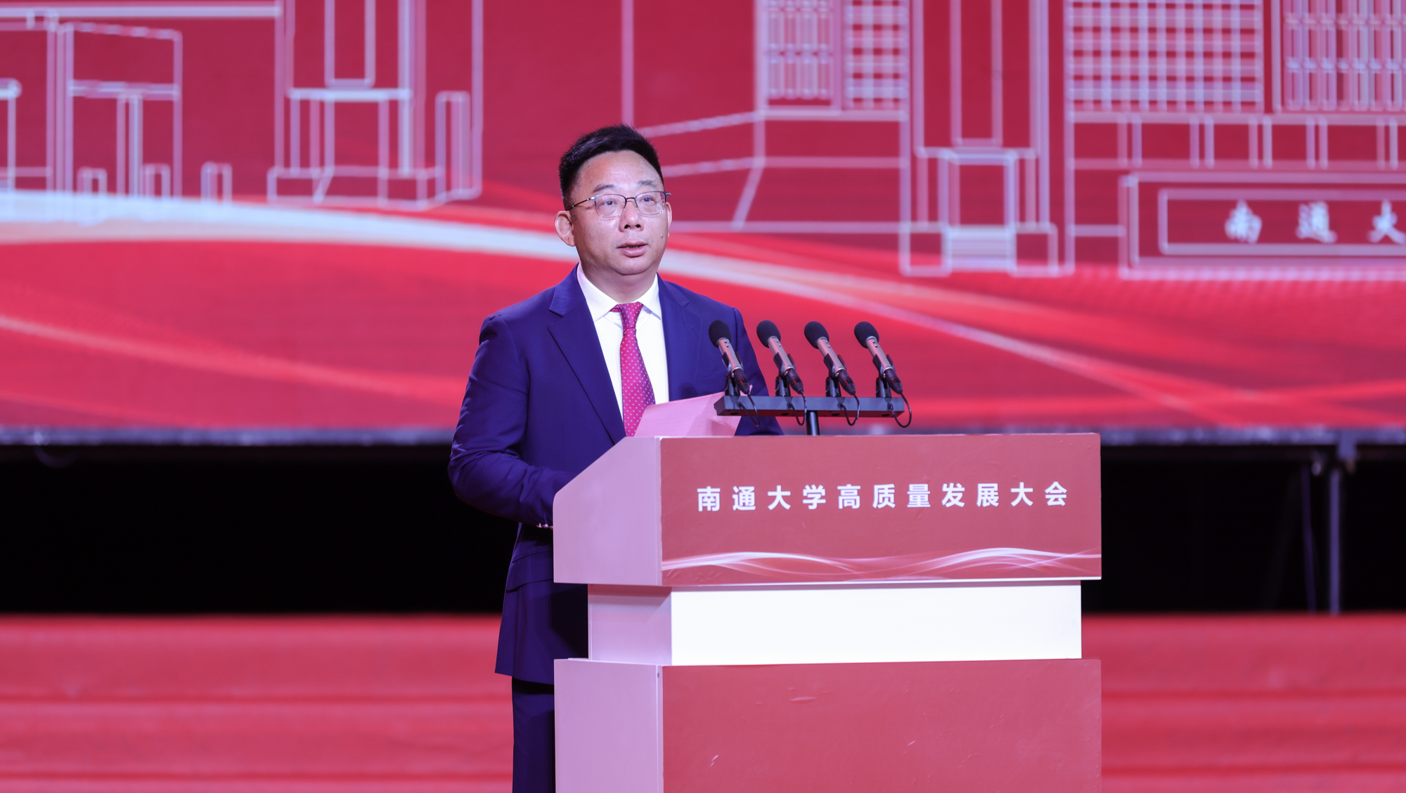 1988级校友、江苏帝奥微电子股份有限公司董事长鞠建宏作为校友代表发言,深情回顾了在通大校园里的求学时光。他说,合并组建20周年是母校发展历程中的一座里程碑,也是所有通大校友共同的节日。他代表20余万海内外校友,向母校致以最热烈的祝贺和最深切的祝福,向一代代勤勤恳恳的通大师生、建设者们致以崇高的敬意,向关心支持母校事业发展的社会各界朋友致以最诚挚的感谢。他指出,20年来,母校历经风雨、沧桑巨变,为党育人、为国育才,书写了一部波澜壮阔、气势恢宏的奋斗史诗。母校校园环境翻天覆地的巨大变化、办学成果日新月异的飞速发展,令校友们备感自豪与振奋。他表示将一如既往、尽己所能支持母校发展,期待海内外通大校友凝心聚力、同向同行,赓续通大传统、践行通大精神、传播通大故事,共同为母校建设添砖加瓦、贡献力量。他祝愿风华正茂、行而不辍的母校,在建设特色鲜明的国内一流大学征程中乘势而上、砥砺前行,再谱新篇章、再创新辉煌。