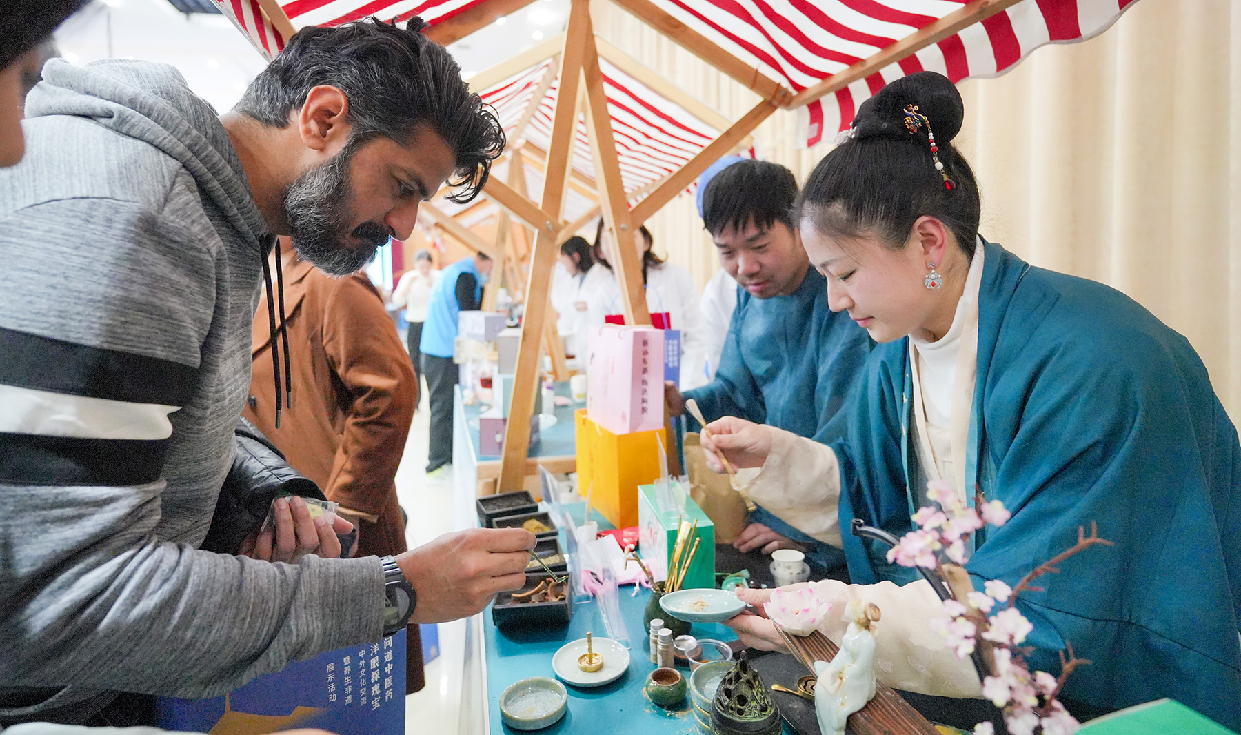 活动现场还设置了18个中医药文化体验区,可以品尝中医保健性糕点和饮品,聆听中药茶饮的冲泡与品鉴方法,体验中医脉诊、推拿、艾灸等技艺。beat365官网意大利籍教师代表MARTINENGHI IVO用中文分享了参加本次活动的体验与感悟。