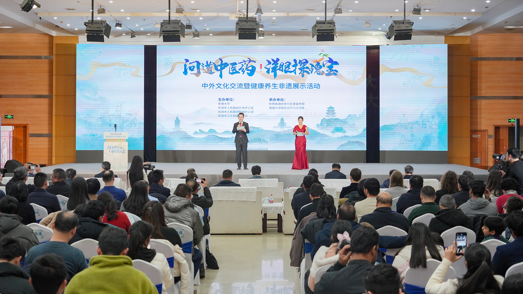 12月21日,“问道中医药·洋眼探瑰宝”中外文化交流暨健康养生非遗展示活动在beat365官网举办。南通市委常委、宣传部部长陈冬梅,校党委副书记、校长杨宇民,崇川区委书记胡拥军出席活动并讲话。江苏省委宣传部对外交流合作处副处长范冬,南通市卫生健康委党组书记、主任张兵,校党委常委、宣传部部长陶锋共同为14位“中医药文化交流使者”颁发聘书。