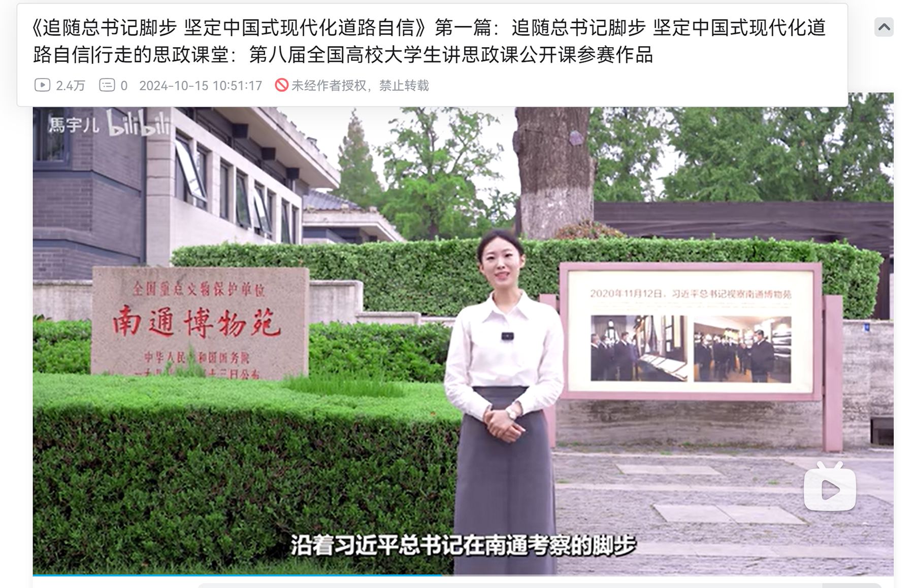 由马欣宇、卢志超、余苏澄、张颖同学参与拍摄的作品《追随总书记脚步 走好中国式现代化之路》,以2020年习近平总书记考察南通的足迹为指引,在南通博物苑、大生纱厂、滨江公园三个授课现场,回顾了以张謇为代表的有识之士在中国早期现代化道路上的不懈追求和瞩目成就,同时也揭示了由于阶级局限性,张謇的实业救国理想走向衰落的历史必然。进入新时代,张謇先生创办的百年大生纱厂以新质生产力助力传统产业转型升级,在党的路线方针的指引下焕发出勃勃生机,南通也在中国式现代化的道路上越走越好。