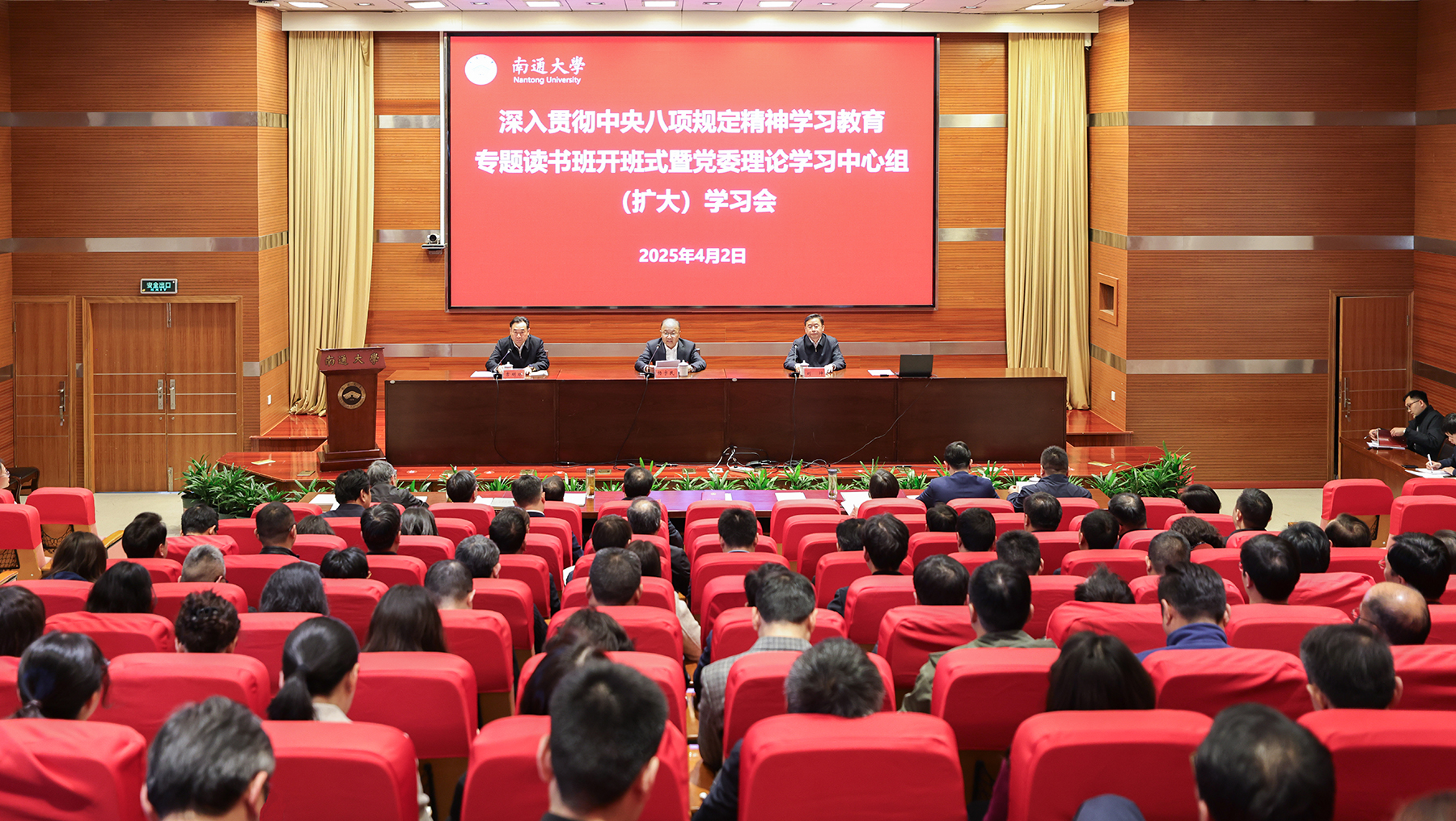 4月2日下午,beat365官网举行深入贯彻中央八项规定精神学习教育专题读书班开班式暨党委理论学习中心组(扩大)学习会。校党委书记、校长杨宇民作开班动员讲话。校党委常委、副校长吉明明主持会议。南通市中级人民法院党组书记、院长、二级高级法官刘坤受邀作专题辅导报告。