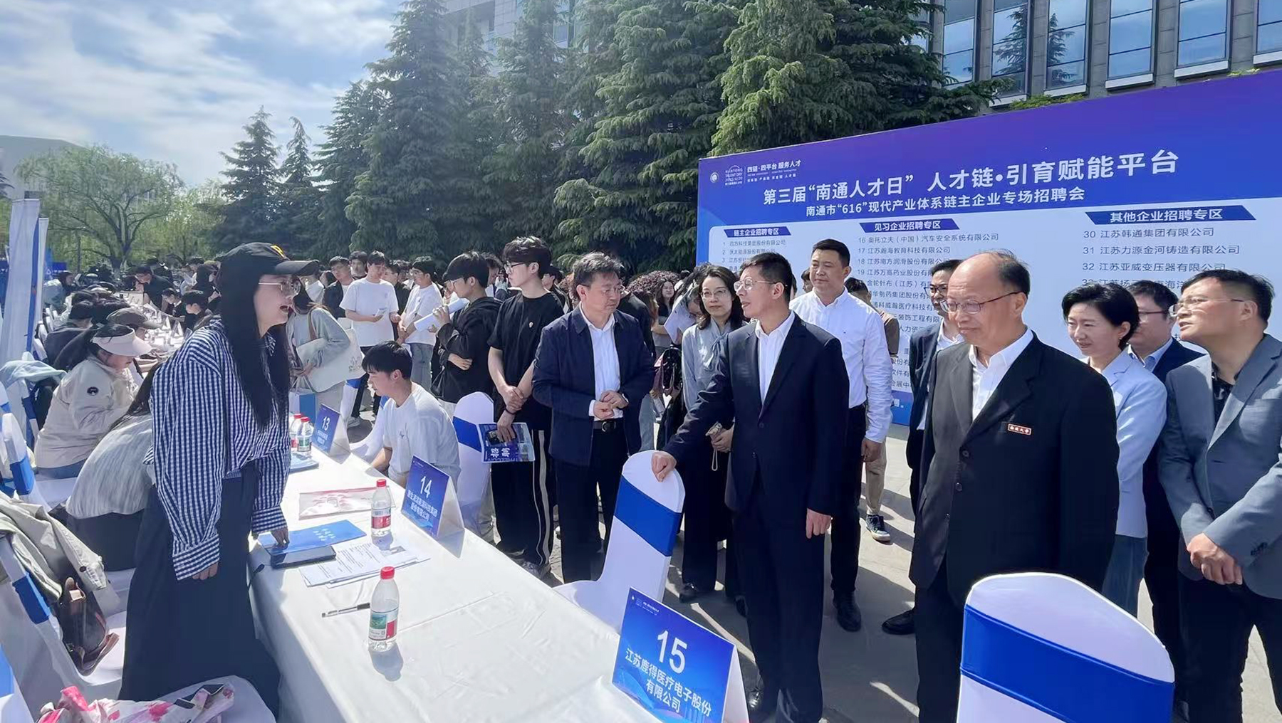 4月20日,南通“人才日”“616”现代产业体系链主企业专场招聘会(在通高校专场)暨校地对接会在beat365官网啬园校区举办。南通市委常委、组织部部长倪春青,校党委书记、校长杨宇民来到招聘会现场,与用人单位代表和毕业生亲切交流。