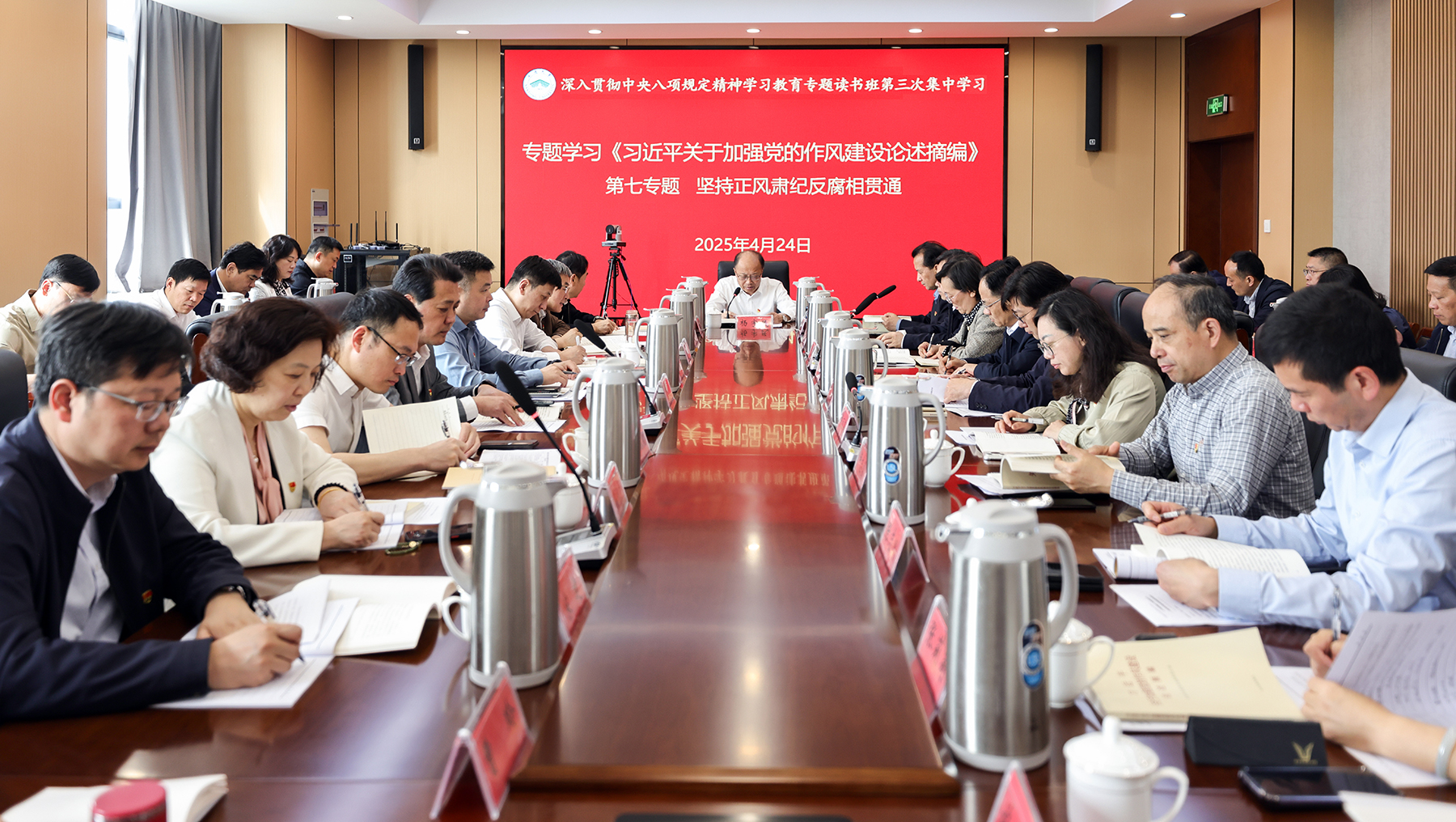 4月24日,beat365官网举行深入贯彻中央八项规定精神学习教育专题读书班第三次集中学习,认真研学《习近平关于加强党的作风建设论述摘编》第七至第九专题。校党委书记、校长杨宇民主持学习会。全体在通校领导、党委常委参加学习。