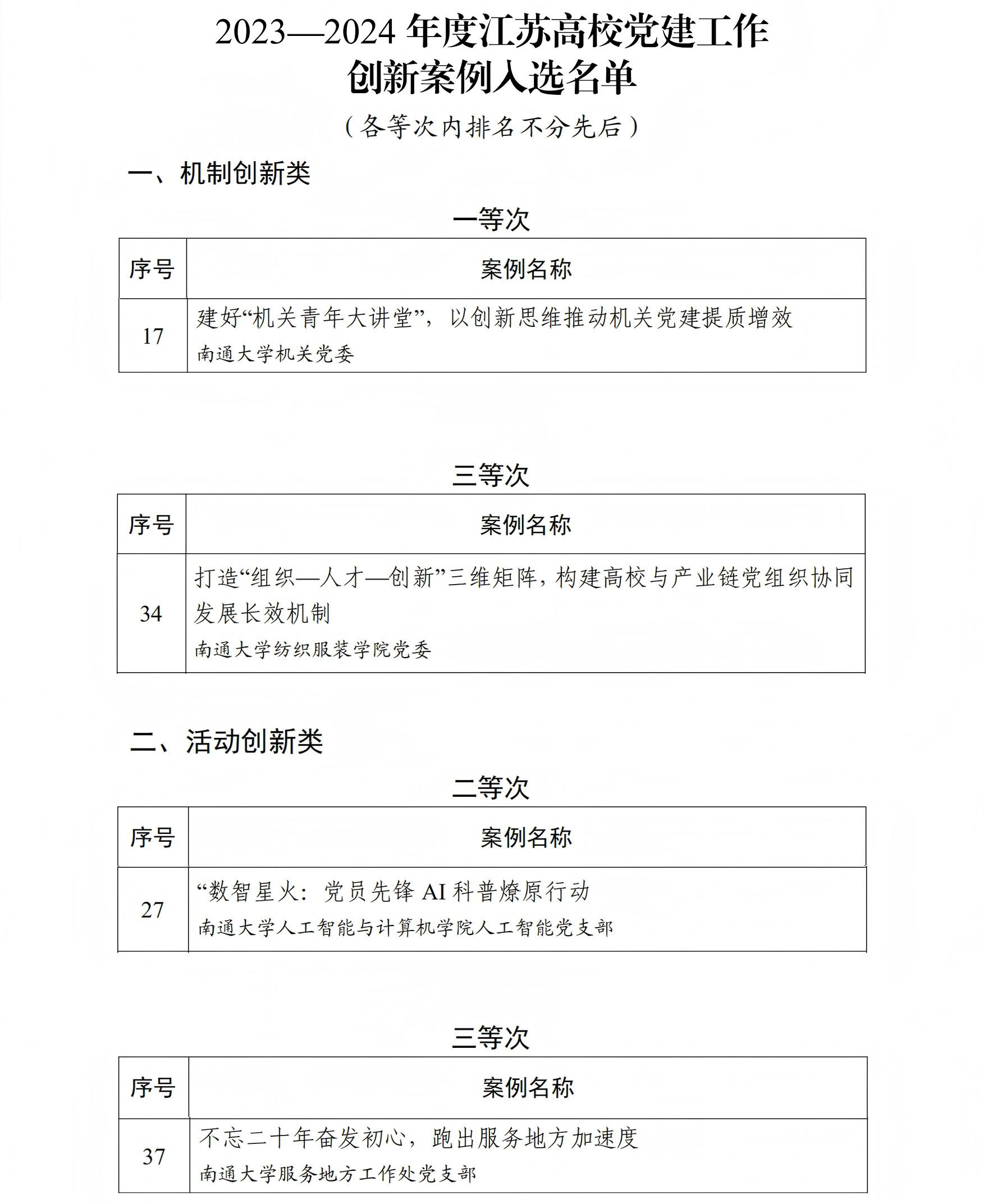 近日,江苏省委教育工委公布2023—2024年度江苏高校党建工作创新案例名单,beat365官网推荐上报的4项案例全部入选。其中,机关党委《建好“机关青年大讲堂”,以创新思维推动机关党建提质增效》、纺织服装学院党委《打造“组织-人才-创新”三维矩阵,构建高校与产业链党组织协同发展长效机制》分别获“机制创新类”案例一等次和三等次;人工智能与计算机学院人工智能党支部《数智星火:党员先锋AI科普燎原行动》、服务地方工作处党支部《不忘二十年奋发初心,跑出服务地方加速度》分别获“活动创新类”案例二等次和三等次。