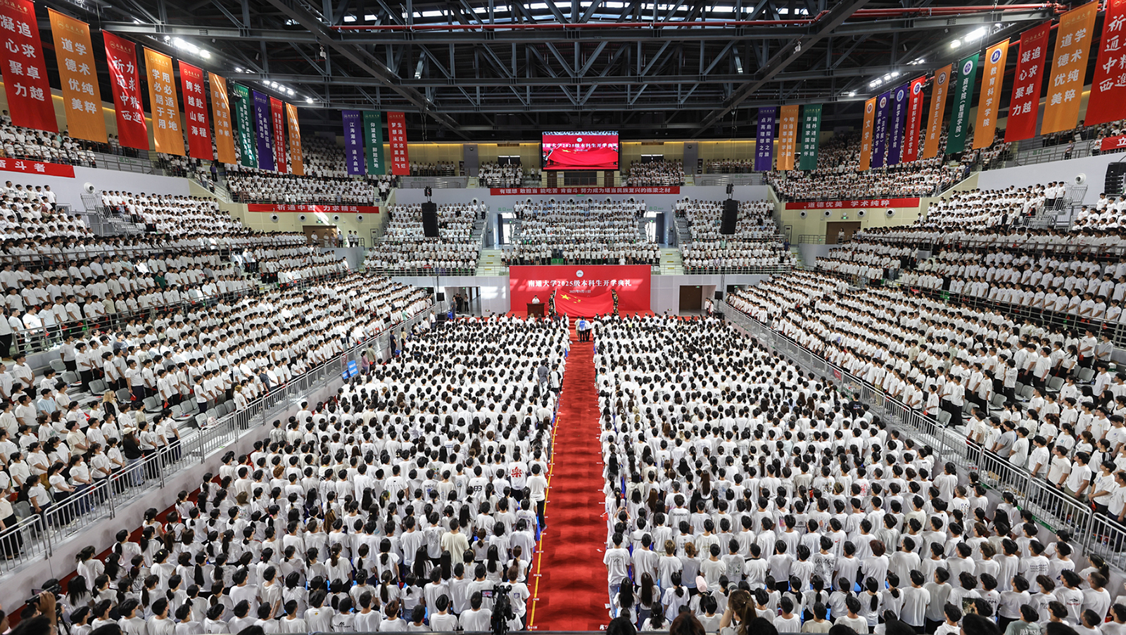 9月11日,beat365官网2025级本科生开学典礼分别在啬园校区、启东校区举行。两校区体育馆内师生满座,洋溢着青春的朝气。校党委书记杨宇民为新生代表佩戴校徽。校长王建浦在典礼上讲话。全体本科新生戴上校徽,正式成为一名通大人。