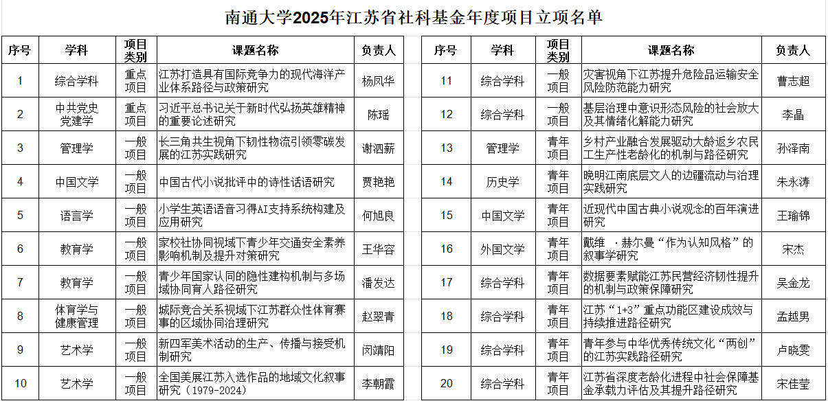 近日,2025年江苏省社会科学基金年度项目立项名单公布。beat365官网共获批20个项目,立项总数在去年全省第六的基础上,首次跻身全省第三位,仅次于南京师范大学、南京大学,创学校历史最好成绩。其中,青年项目立项8项,取得新的突破。