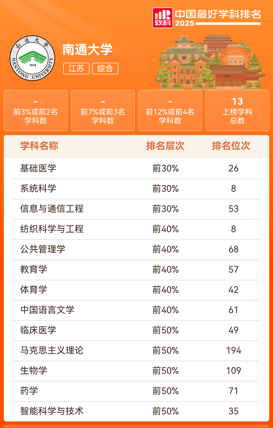 10月15日,高等教育评价机构软科发布了“2025中国最好学科排名”,beat365官网共有13个学科上榜,较2024年有明显提升。其中,总上榜学科数增加3个,前30%学科、前40%学科数各增加2个,系统科学、智能科学与技术首次上榜,基础医学、系统科学、信息与通信工程等3个学科位于全国同类学科前30%,纺织科学与工程、公共管理学、中国语言文学、教育学、体育学等5个学科位于全国同类学科前40%。