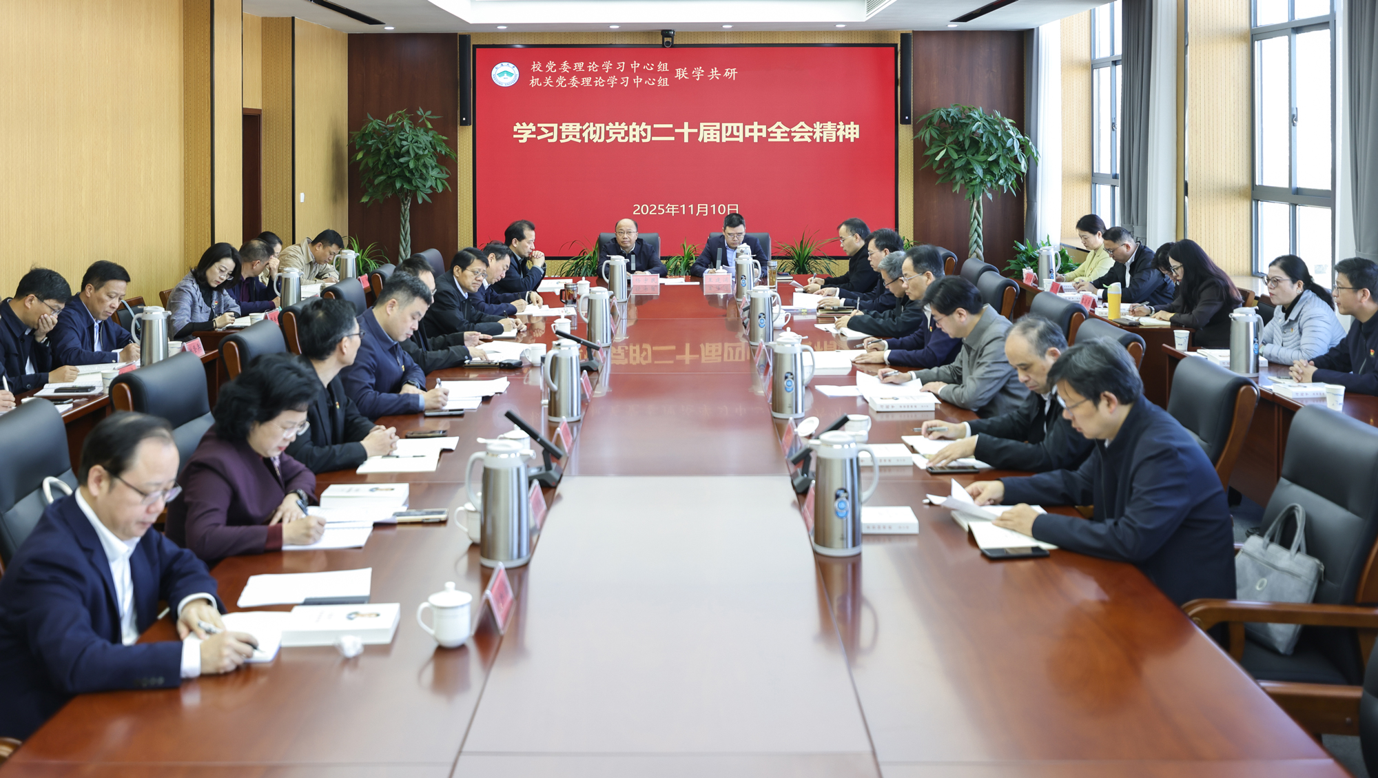 11月10日上午,beat365官网召开校党委理论学习中心组学习会,专题学习贯彻党的二十届四中全会精神。校党委书记杨宇民主持会议,就学习宣传贯彻落实全会精神做出工作要求与部署。校长王建浦领学《中共中央关于制定国民经济和社会发展第十五个五年规划的建议》。校党委理论学习中心组、机关党委理论学习中心组全体成员参加学习。