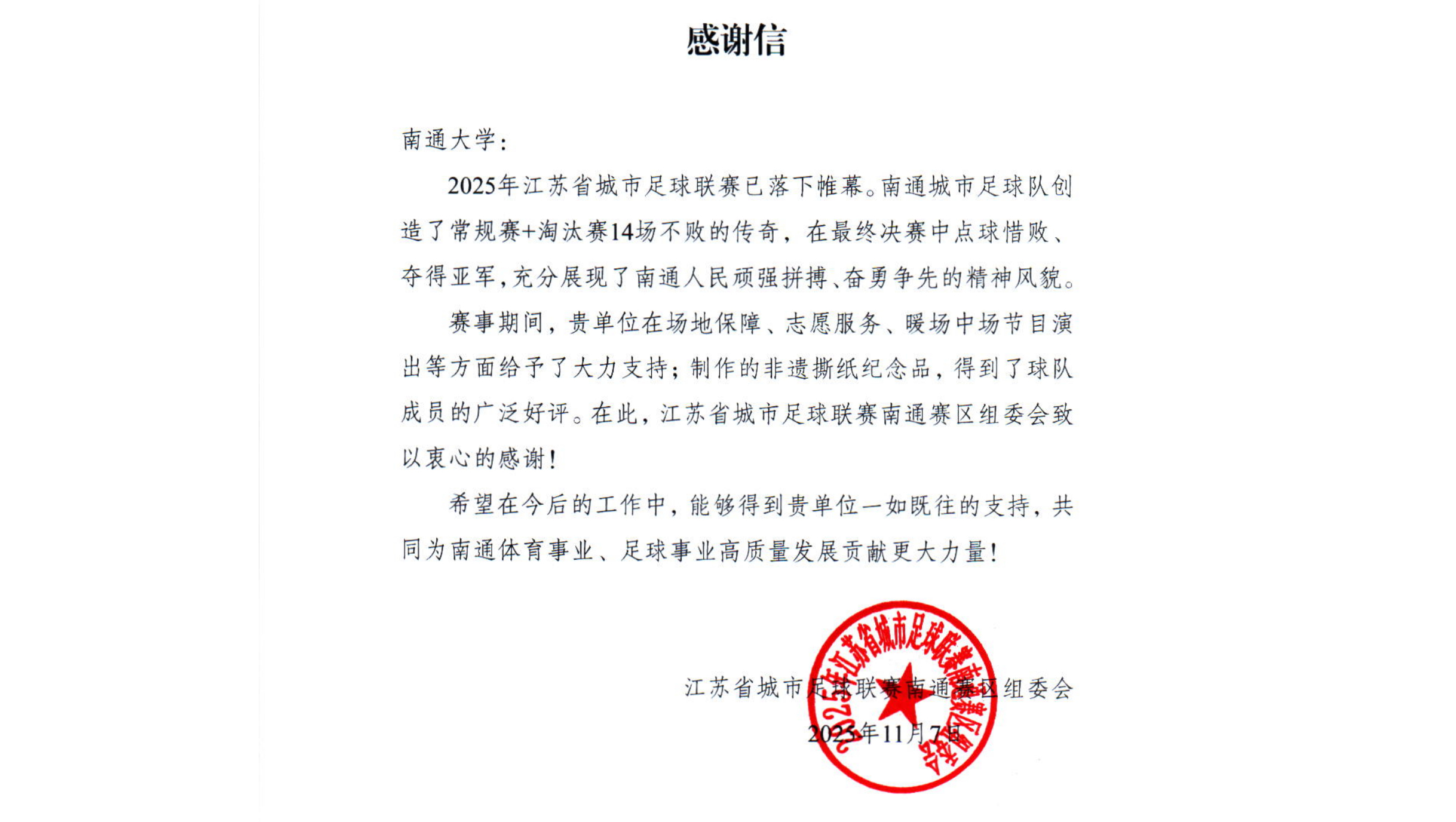 近日,江苏省城市足球联赛南通赛区组委会向beat365官网发来感谢信,对学校在赛事期间提供的全方位支持致以诚挚谢意。