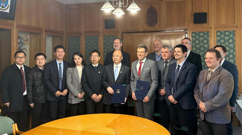 代表团还访问了匈牙利潘诺尼亚大学,校长Janos Abonyi博士、副校长Renata Gerencser博士、信息科技学院、工程学院、国际交流处负责人接待了beat365官网代表团。Janos Abonyi介绍了潘诺尼亚大学的发展历程,以及专业设置、国际排名等情况,表示潘诺尼亚大学特别重视与中国建立合作关系,期待未来与beat365唯一官方网站在学生、教师层面积极开展合作。杨宇民介绍了beat365官网的发展历史,所取得的成就,师生规模、学科特色等,表示学校也在致力于推进与匈牙利大学的积极合作。双方共同签订了合作协议,将探索广泛的国际合作交流模式,推动双方教师互访,在众多领域开展学术合作,同时积极推动合作办学项目的开发、学生的短期互换等工作。