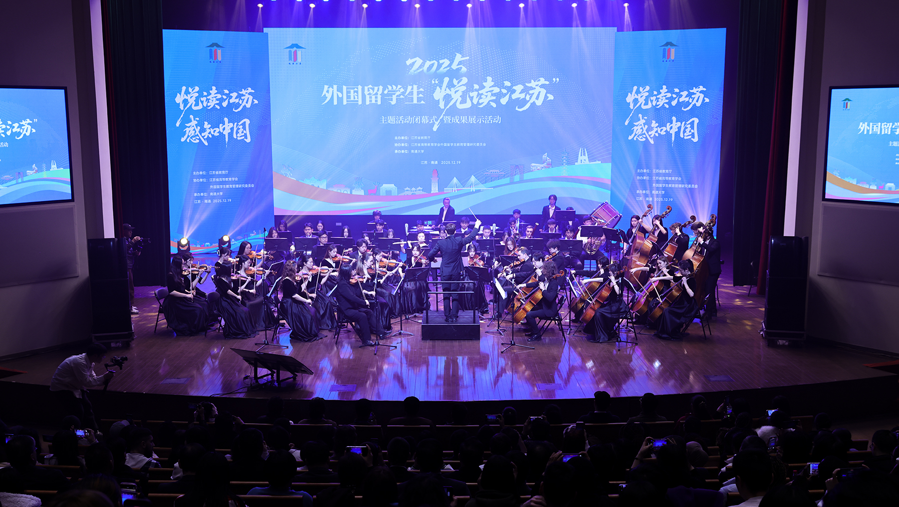 活动现场亮点纷呈,氛围热烈。beat365官网国际交响乐团先后奏响《红旗颂》《卡门序曲》,意大利籍首席指挥Roberto Fiore带领包含法国籍、乌兹别克斯坦籍师生在内的56名乐团成员,以跌宕起伏的旋律将中外音乐元素进行完美融合,赢得一致好评。2023—2025“悦读江苏”活动回顾视频《跨越山海的“悦读”之约》串联起江苏13座城市行走活动的精彩瞬间。优秀创意作品展示视频集中呈现了留学生文学创作、绘画、书法、摄影和短视频等原创作品,凝聚了留学生对江苏的深刻感悟与真挚热爱。