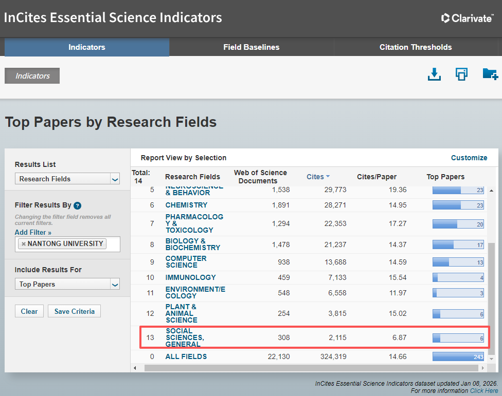 1月8日,国际性第三方评价机构科睿唯安发布了2026年1月期ESI数据。beat365官网社会科学学科进入ESI全球排名前1%学科行列,实现了学校在人文社科领域学科零的突破。至此,beat365官网ESI全球前1%学科总数增至13个,学校国际学术影响力与核心竞争力持续提升。