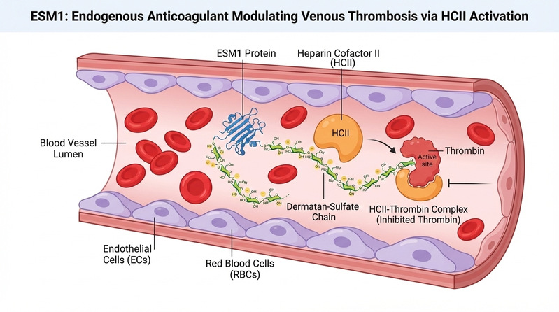 ESM1是一种由内皮细胞分泌的蛋白多糖,在静脉血栓(VTE)患者中水平显著升高,但其在凝血调节中的作用机制尚不清楚。该团队通过临床分析、动物模型实验和体外生化分析,全面研究了ESM1在抗凝血中的作用机制。研究发现,VTE患者血清中ESM1的浓度显著高于健康对照组,且ESM1与D-二聚体的联合检测能显著提高诊断准确性。通过斑马鱼和小鼠模型,团队发现ESM1的缺失会导致血管闭塞,而ESM1的过表达则能显著减少静脉血栓形成并延长闭塞时间。机制研究表明,ESM1的抗凝作用依赖于其共价连接的糖胺聚糖(GAGs),特别是通过激活抗凝血酶HCII来抑制凝血酶活性。该研究获得了国家自然科学基金支持。